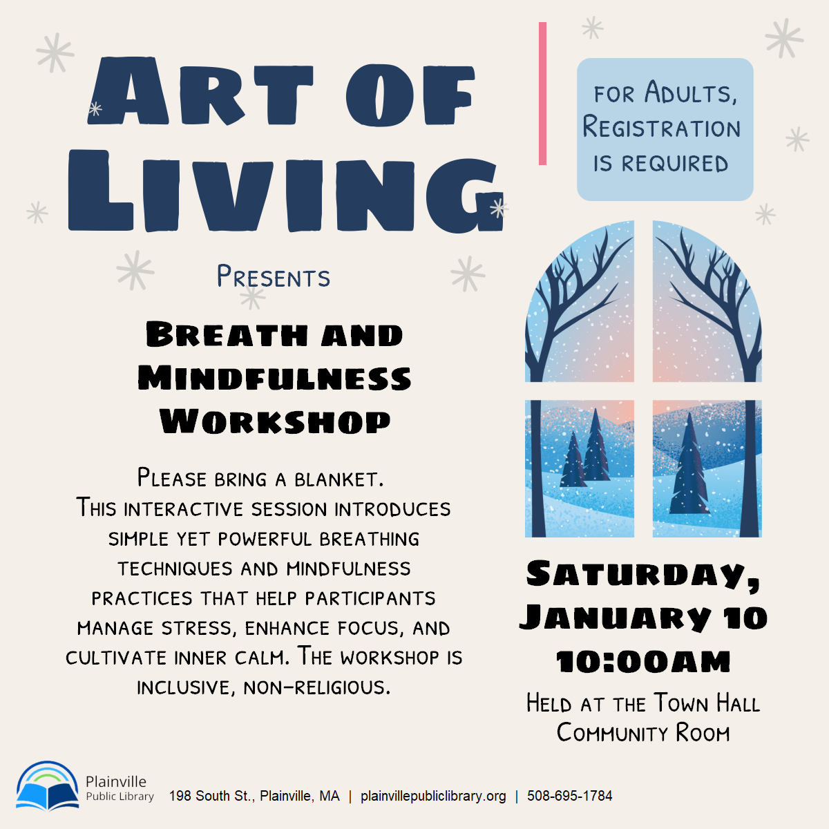 Town Hall Community Room “Breath and Mindfulness Workshop.” This interactive session introduces simple yet powerful breathing techniques and mindfulness practices that help participants manage stress, enhance focus, and cultivate inner calm. The workshop is inclusive, non-religious, and designed for adults. Please bring a blanket. Presented by the The Art of Living, a global non-profit educational and humanitarian organization founded by Sri Sri Ravi Shankar. Rooted in the philosophy that life itself is an art to be lived with awareness, balance, and joy, the organization offers programs that blend ancient wisdom with practical tools for modern living. Register online between 11/4/2025 12:00 AM and 1/9/2026 11:45 PM.