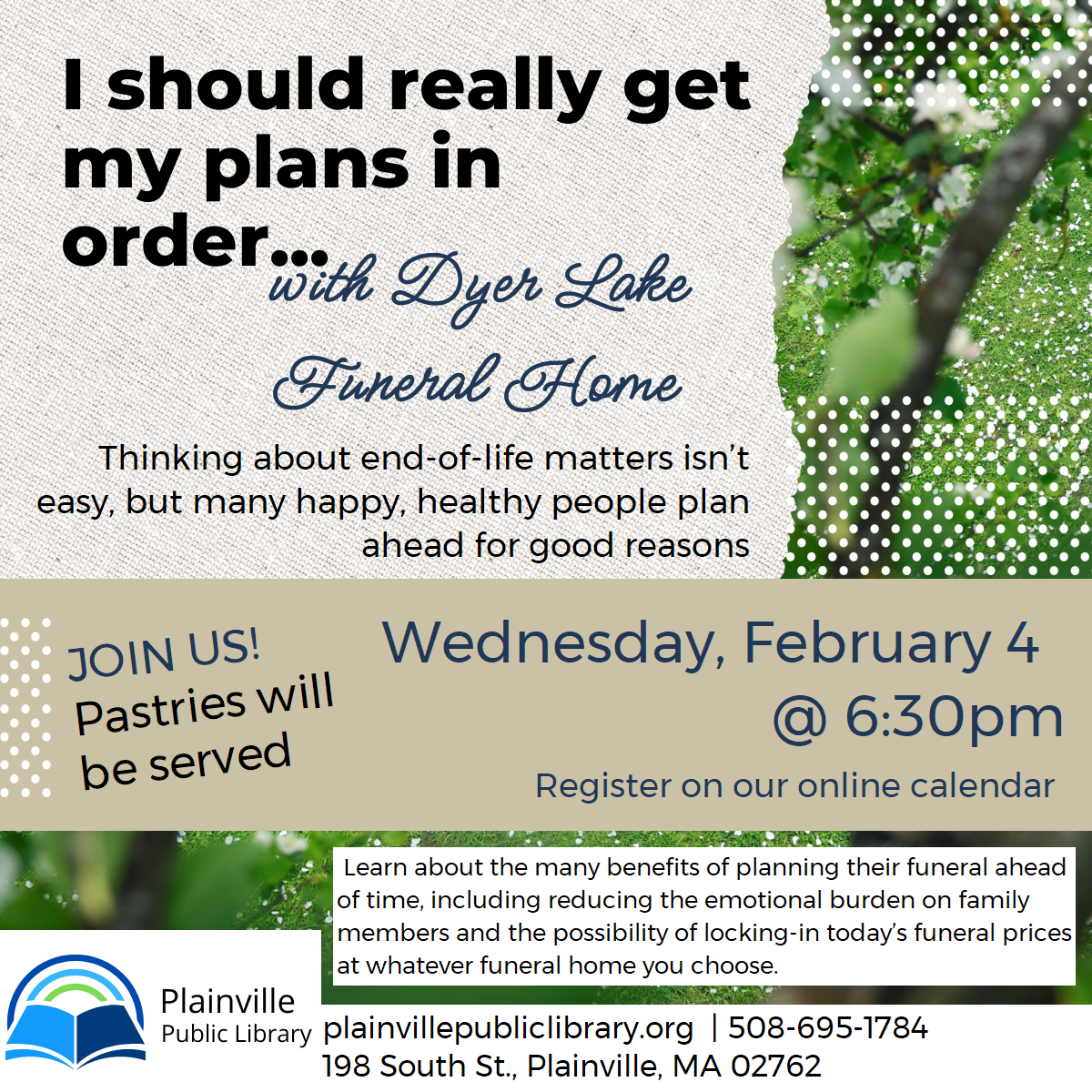 Thinking about end-of-life matters isn’t easy, but many happy, healthy people plan ahead for good reasons. Attendees will have the chance to learn about the many benefits of planning their funeral ahead of time, including reducing the emotional burden on family members and the possibility of locking-in today’s funeral prices. Planning in advance gives you the chance to choose how you want to be remembered by family and friends. It allows you to choose what’s most important to you instead of relying on others to guess at what you would have wanted. Pastries will be served. Registration is required. Everyone will go home with a packet of planning materials. Presented by the staff at the Dyer-Lake Funeral Home. Register online between 1/8/2026 12:00 AM and 2/4/2026 5:00 PM.