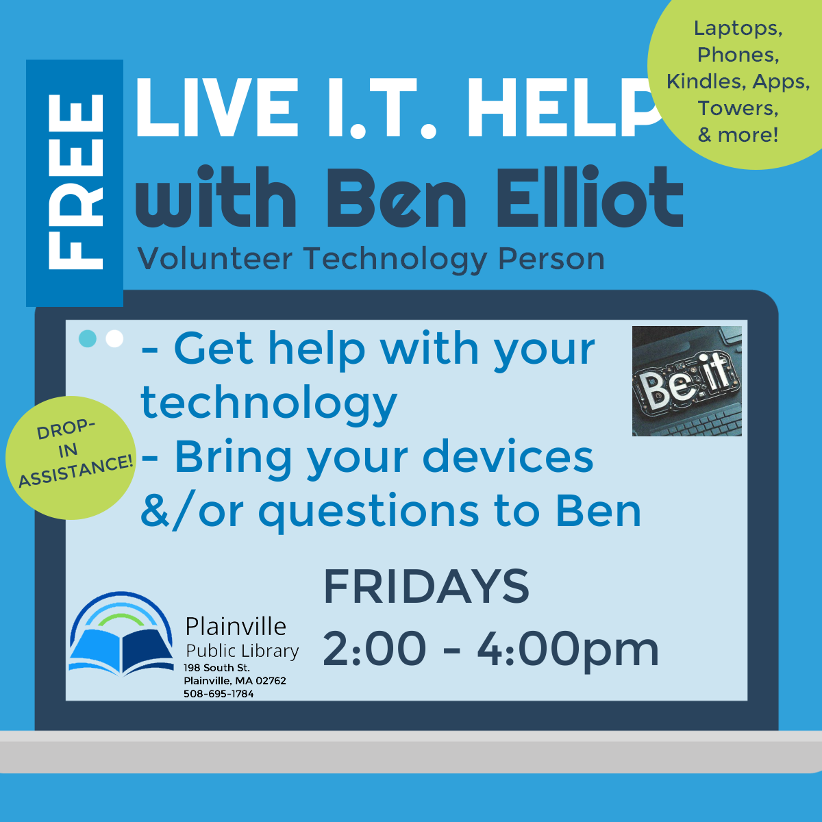 NEW - Book an appointment at https://befreeit.org Is your computer not working right? Do you have questions about your phone or Apps? Bring your tech and get free IT help from Ben, volunteer IT person. He can help with your Tech Support questions. *Diagnosing and finding solutions to any and all issues like slow speeds, unwanted pop-ups, security concerns, computer not booting, can’t connect to Wifi, etc *PC tune ups and maintenance, Virus removal/prevention *Password resets for locked Computers *Recovering deleted files (Luck may required here) *General tech questions, what works best for certain things and why *Migrating to a new phone/computer, help with apps, how to store and print photos, etc. AND MORE! Privacy is, of course, maintained. Please see more info at the library.