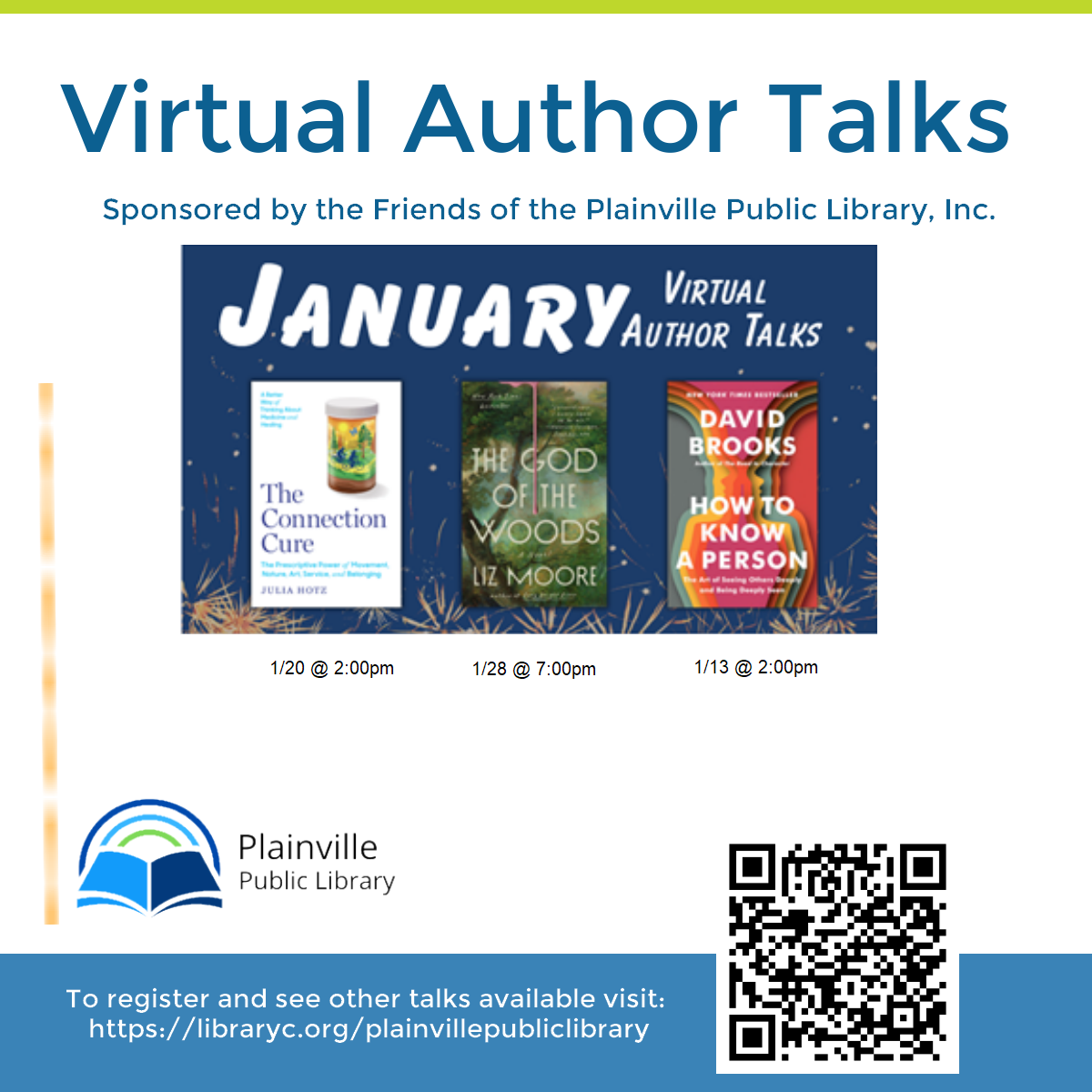Register for Link The Connection Cure: The Prescriptive Power of Movement, Nature, Art, Service, and Belonging combines diligent science reporting, moving patient success stories, and surprising self-discovery to help us discover the lasting and life-changing power of social prescribing. Traditionally, when we get sick, health care professionals ask, “What’s the matter with you?” But around the world, teams of doctors, nurses, therapists, and social workers have started to flip the script, asking “What matters to you?” Register for Link Here Sponsored by the Friends of the Plainville Public Library, Inc.