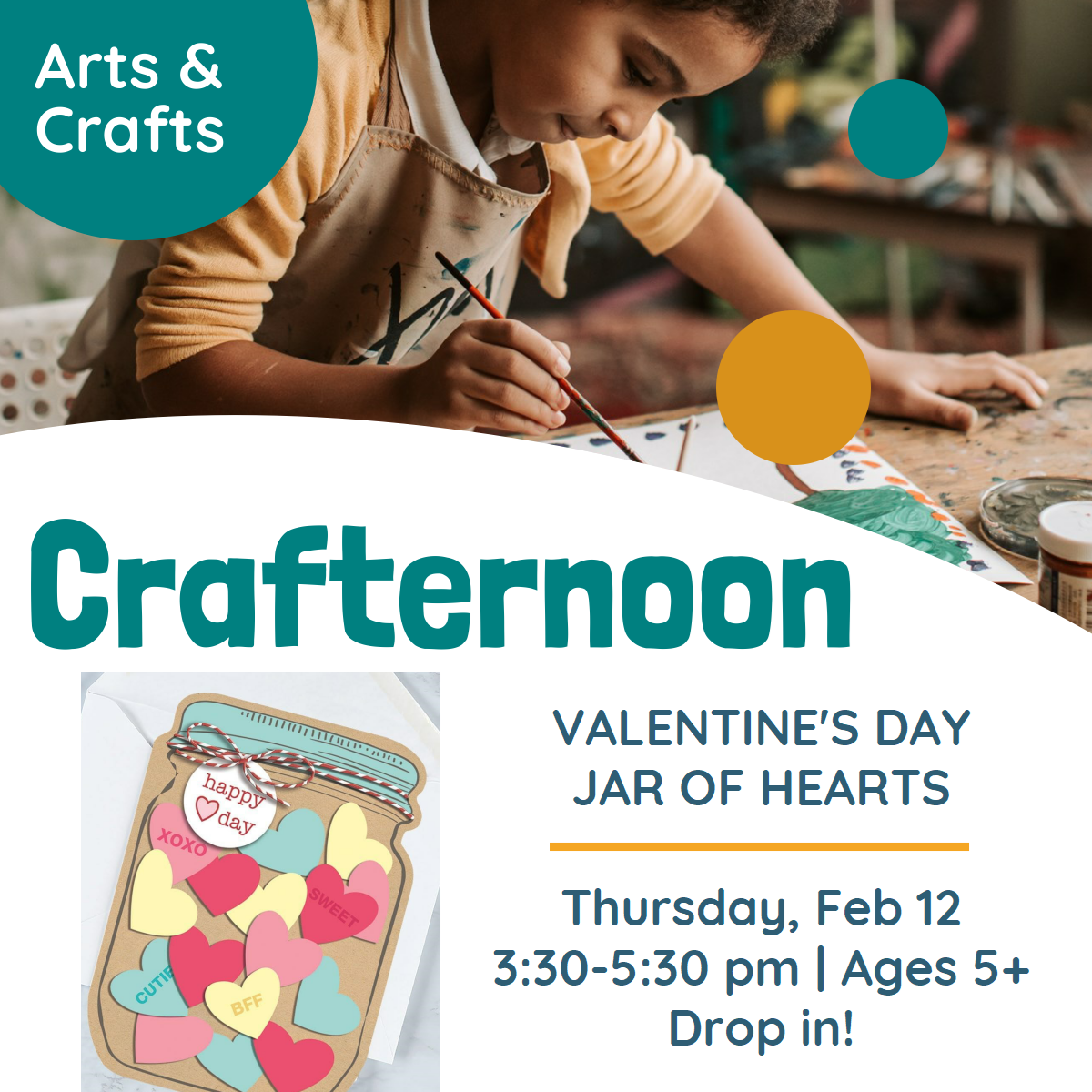 Thursday, February 12, 2026 3:30—5:30 PM Children's Room Drop in In preparation for our favorite Day of Love, we'll be offering a drop-in Valentine's Day craft in the Children's Department for ages 5+. Decorate a card that looks like a Mason jar full of Conversation Heart candies!