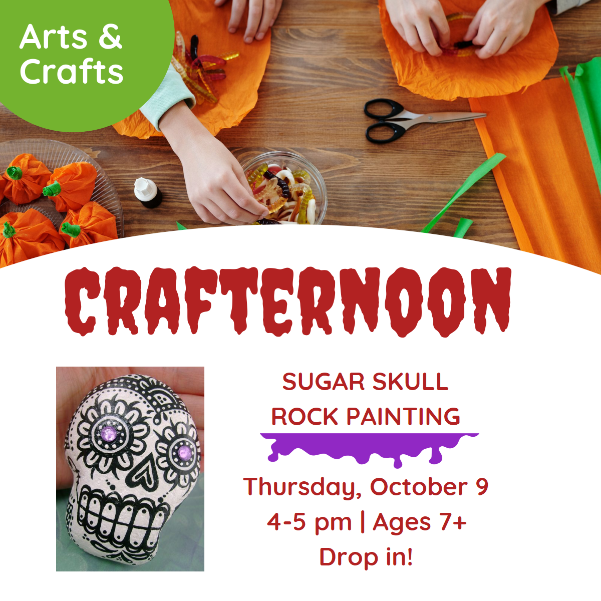 Spooky season is upon us, and we're celebrating with painted sugar skull rocks! Using pre-painted rocks and sharpies, we'll be decorating rocks with intricate patterns to resemble Day of the Dead sugar skulls. This program is best for kids ages 7+. Please note, we have a limited number of rocks, so this craft is offered on a first come, first served basis.