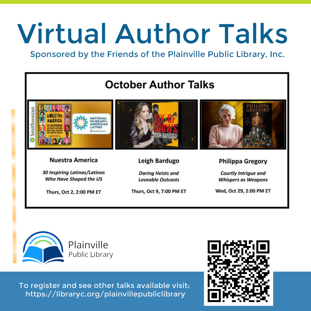 Thursday, October 9, 2025 7:00—8:00 PM Register for Link Since publishing in 2015, Leigh Bardugo’s highly popular Six of Crows has taken the world of YA literature by storm–and it’s not hard to see why. The complex fantasy setting, thoughtfully-structured magic system, and deliciously morally gray characters all collide in a world you won’t want to leave and you don’t have to! Join us as we pick the brain of the New York Times bestselling author herself, celebrating the release of her Six of Crows (The Dregs Edition), Thursday October 9th at 7 PM ET via digital live-stream in partnership with Plainville Public Library. Register for Link Here Sponsored by the Friends of the Plainville Public Library, Inc.