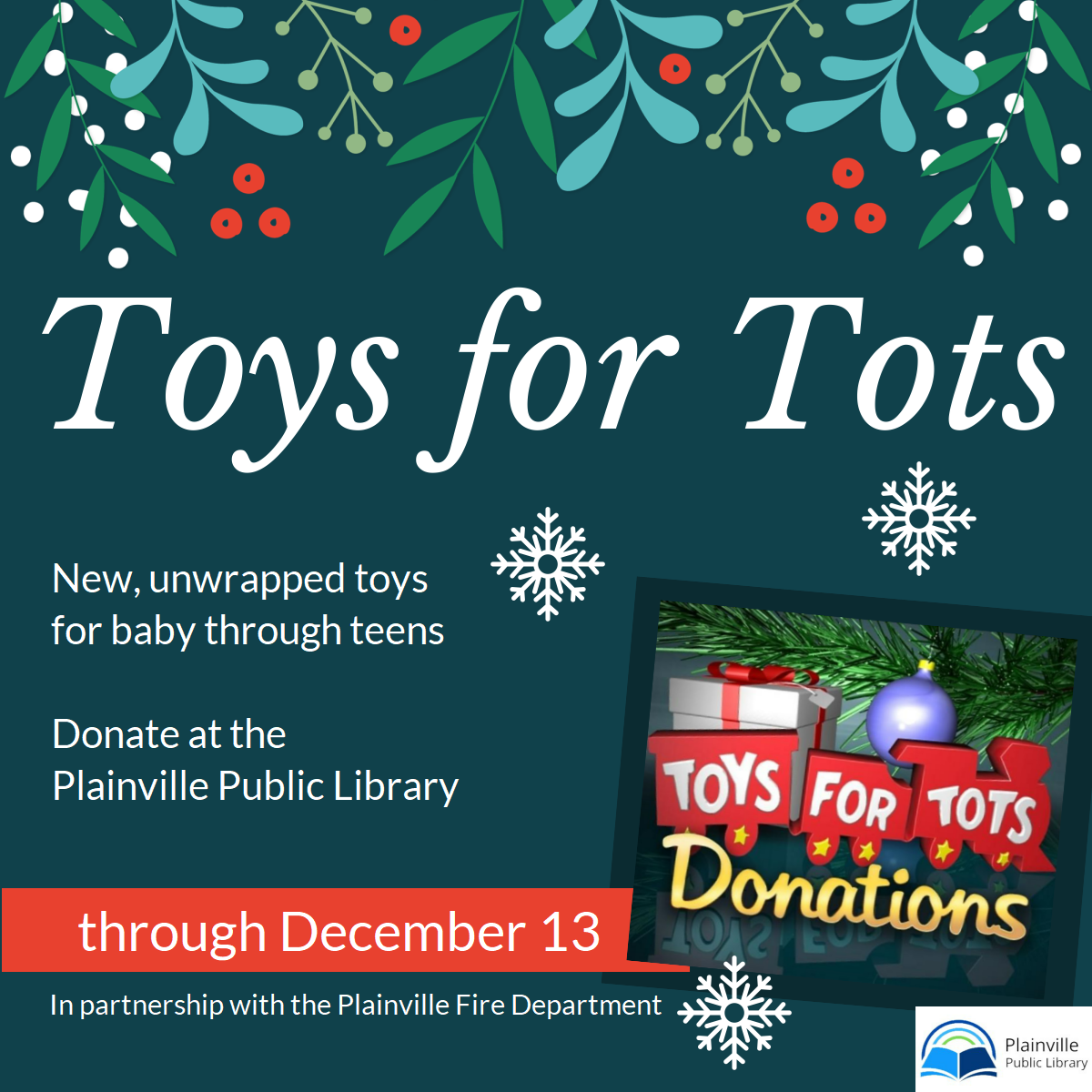 Drop off new and unwrapped toys for ages baby through teen at the Plainville Public Library during regular library hours starting in November. The last day for donations is December 16 to ensure delivery for the holidays. Thank you for your generosity!