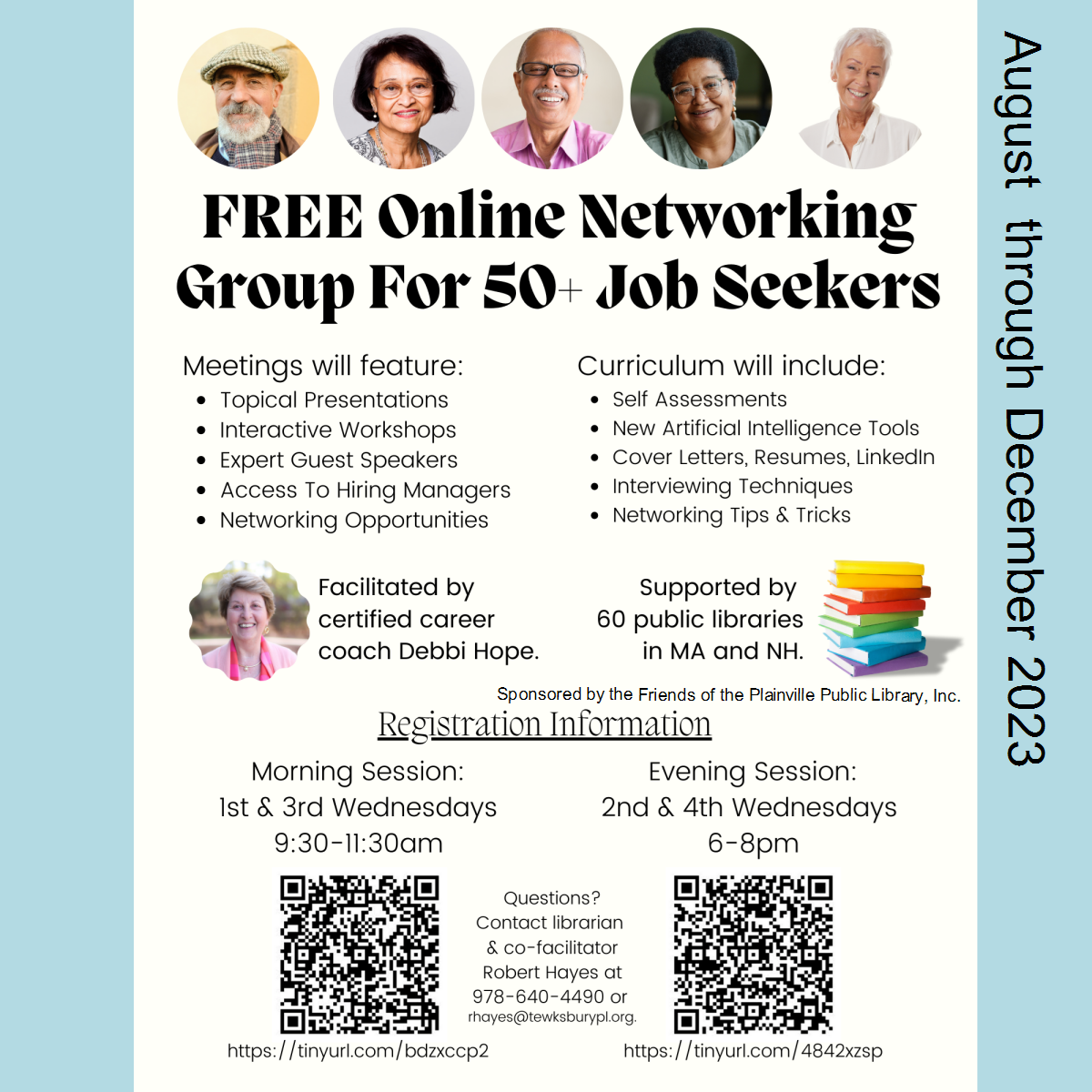 The Massachusetts Library Collaborative's 50+ Job Seekers Group meets on the 1st and 3rd Wednesdays of the month, from 9:30am to 11:30am, and on the 2nd and 4th Wednesdays of the month at 6:00pm via Zoom. Register via the links on our website. If you are unemployed and actively looking, underemployed, seeking a new career direction, re-entering the job market after a long employment gap, or recently retired and looking for your "Encore Career", this networking group program is perfect for you! Remember, 85% of jobs are found through networking!