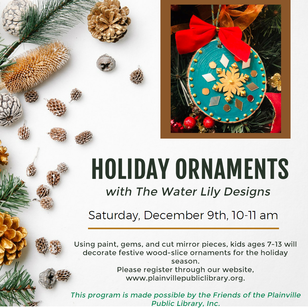 Niloufer Rakhangi from The Water Lily Designs will be hosting an ornament decorating craft for kids. Using paint, gems, and cut mirror pieces, participants will decorate festive wood slices for the holiday season. This program is for ages 7-13. Registration is required; please register online. If you register and then decide you cannot attend, please email cchenelle@sailsinc.org ASAP so your child's spot can be given to someone else. This program is made possible by the Friends of the Plainville Public Library, Inc.