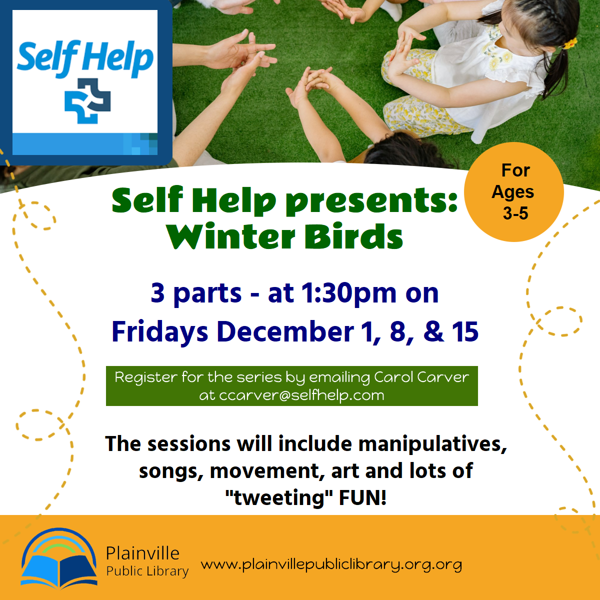Winter Perches-Series on Birds: In this 3-week series on winter birds, children will gain information about specific birds, prepare a food celebration for them and help the birds get ready for spring by painting birdhouses and making nesting balls of yarn! The sessions will include manipulatives, songs, movement, art and lots of "tweeting" FUN! Presented by Self Help, Inc. for Preschoolers and thier caregivers. REGISTER by emailing Carol:ccarver@selfhelpinc.org