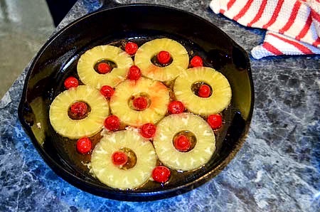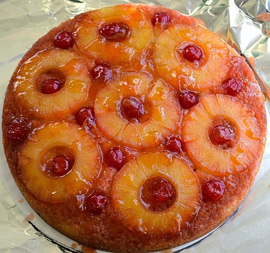 Preheat the oven to 350. A frying pan or 12-inch pie plate is recommended. Spray the pan with a nonstick spray. Drain the pineapple, reserving the juice, and dry the rings on a paper towel. Place the pineapple rings around the pan in any pattern you prefer (there may be some left over). Place the cherries (and pecans) in the holes of the pineapple and in the spaces around them. Set aside and prepare the cake. Cake 1 cup sifted all-purpose flour 1/3 tsp. baking powder 1/4 tsp. salt 2 eggs 2/3 cup sugar 1 tsp. vanilla extract 6 TBS. drained pineapple juice 1/2 cup apricot preserves (for the glaze) Sift together the flour, baking powder and salt. Beat the eggs at high speed for one minute. Continue to beat while slowly adding the sugar. Beat for about 5 minutes, until the mixture is thick and pale. Add the vanilla. Add the pineapple juice. Beat on low speed until mixed. On low speed, add the sifted dry ingredients, beating only until smooth. Pour the batter over the pan and bake for 30-40 minutes until the top of the cake springs back when lightly pressed and a toothpick inserted in the middle comes out clean. Remove from the pan immediately. Apricot Glaze While the cake is baking, prepare an apricot glaze by heating 1/2 cup of apricot preserves. As soon as the cake comes out of the oven, brush the glaze over the top of the cake.