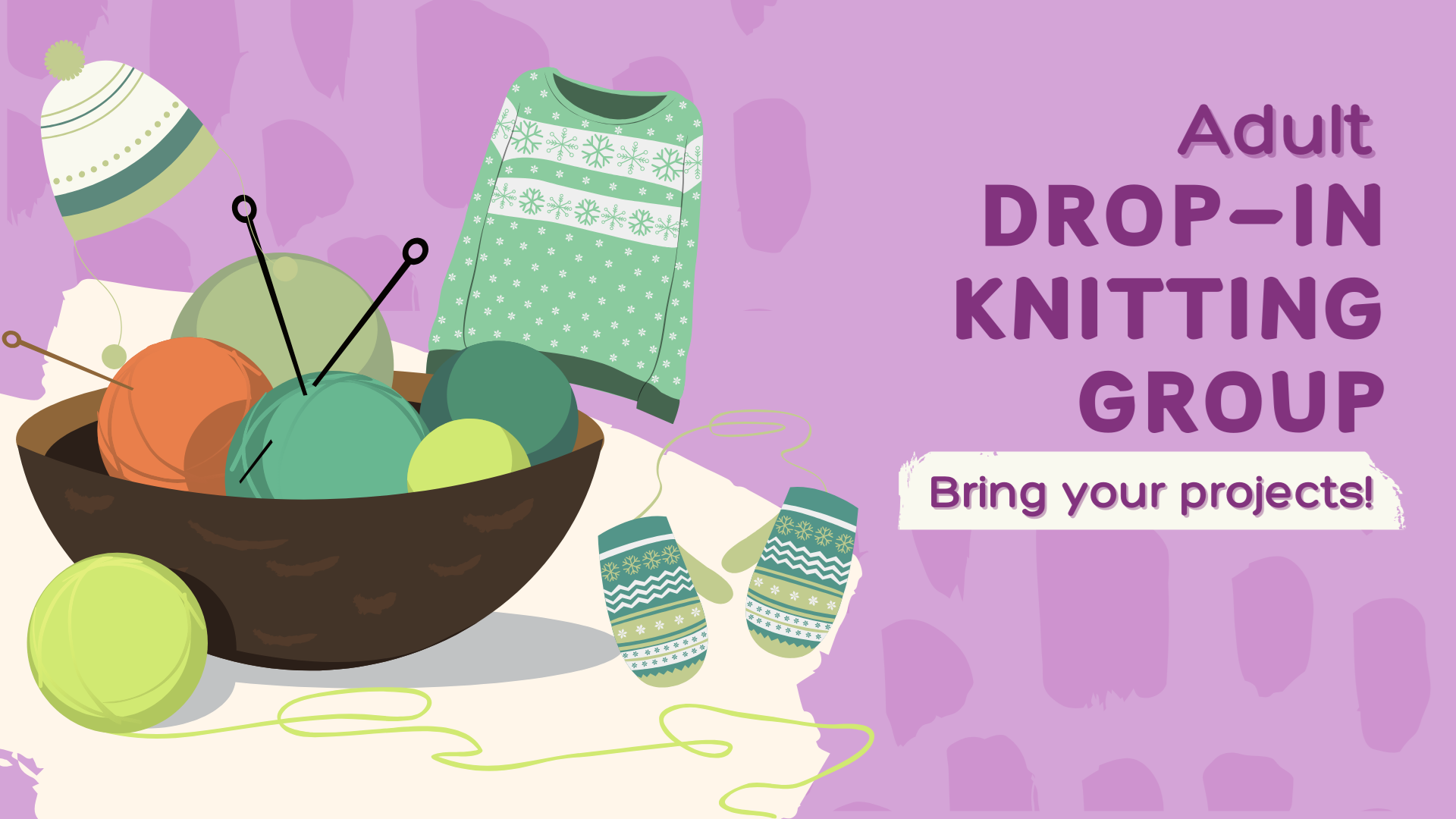 This is not an instructional class but beginners are welcome to attend as experienced knitters are more than happy to share their wisdom. So, if you want to learn a new hobby, please join us! Drop-in any time from 10:00AM to 1:00PM and stay as long as you'd like.