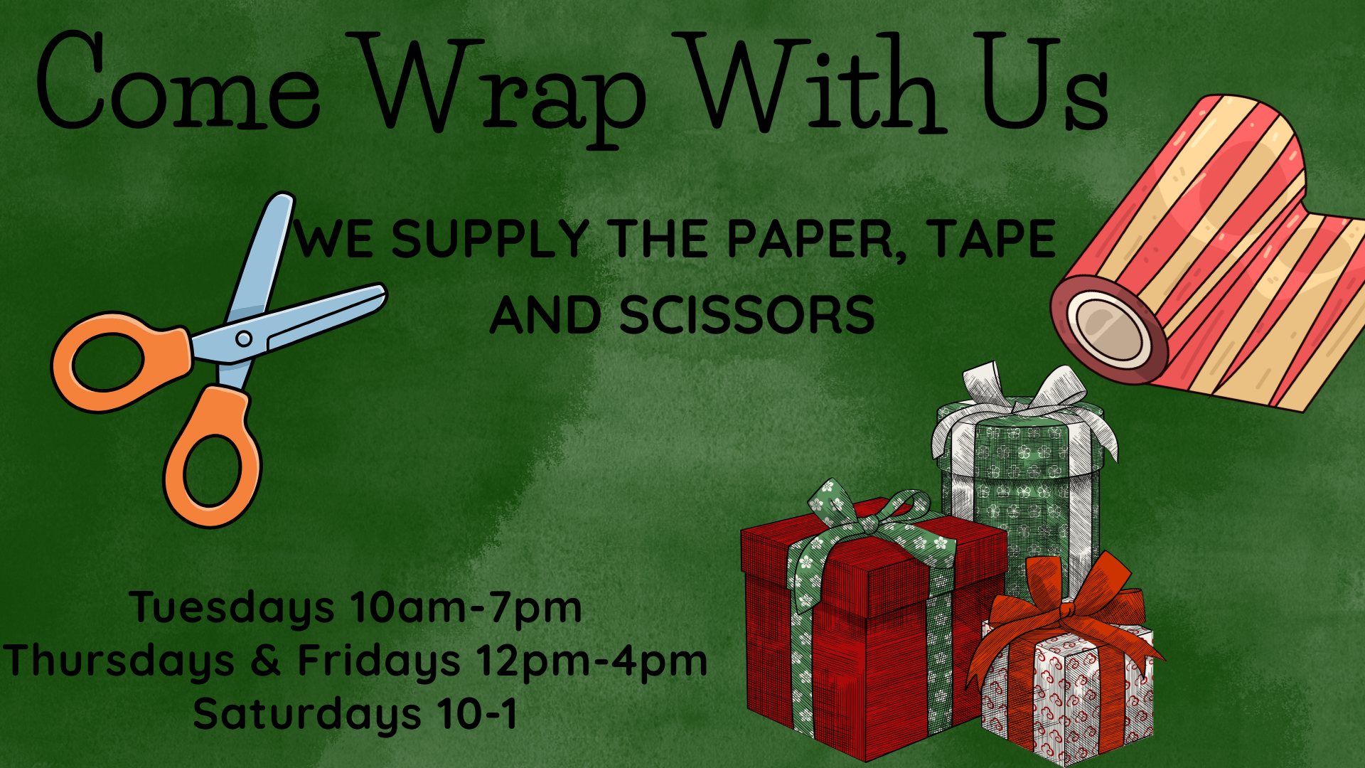 From December 2nd - 23rd, the library will be offering wrapping stations. We will provide the paper, scissors and tape. Simply come by during the designated hours and wrap!