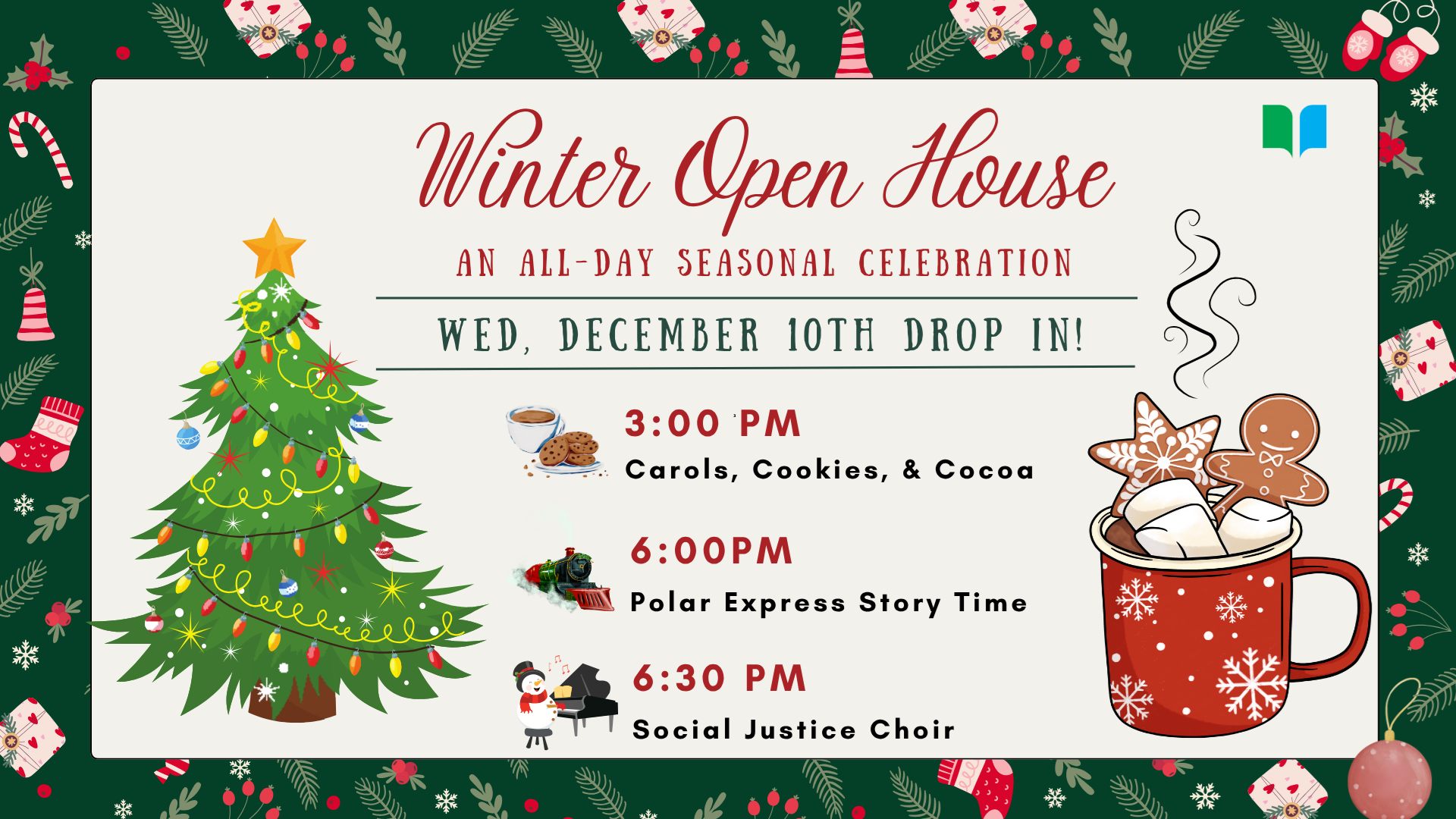 Join us for a holiday sing-a-long featuring holiday classics we all love! Stop by for warm drinks, treats, and songs for a memorable afternoon. There may even be an appearance by a few special people beginning at 4pm. I hope you were nice and not naughty! 🎅 No Registration Required. Drop in! |