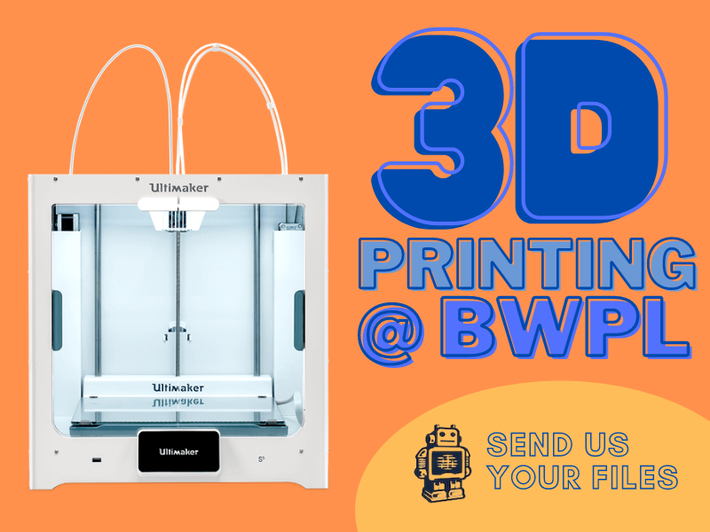 Use our Ultimaker S5 printer for school projects, home fix-it jobs, crafting, toys, jewelry making, costume design, & more!