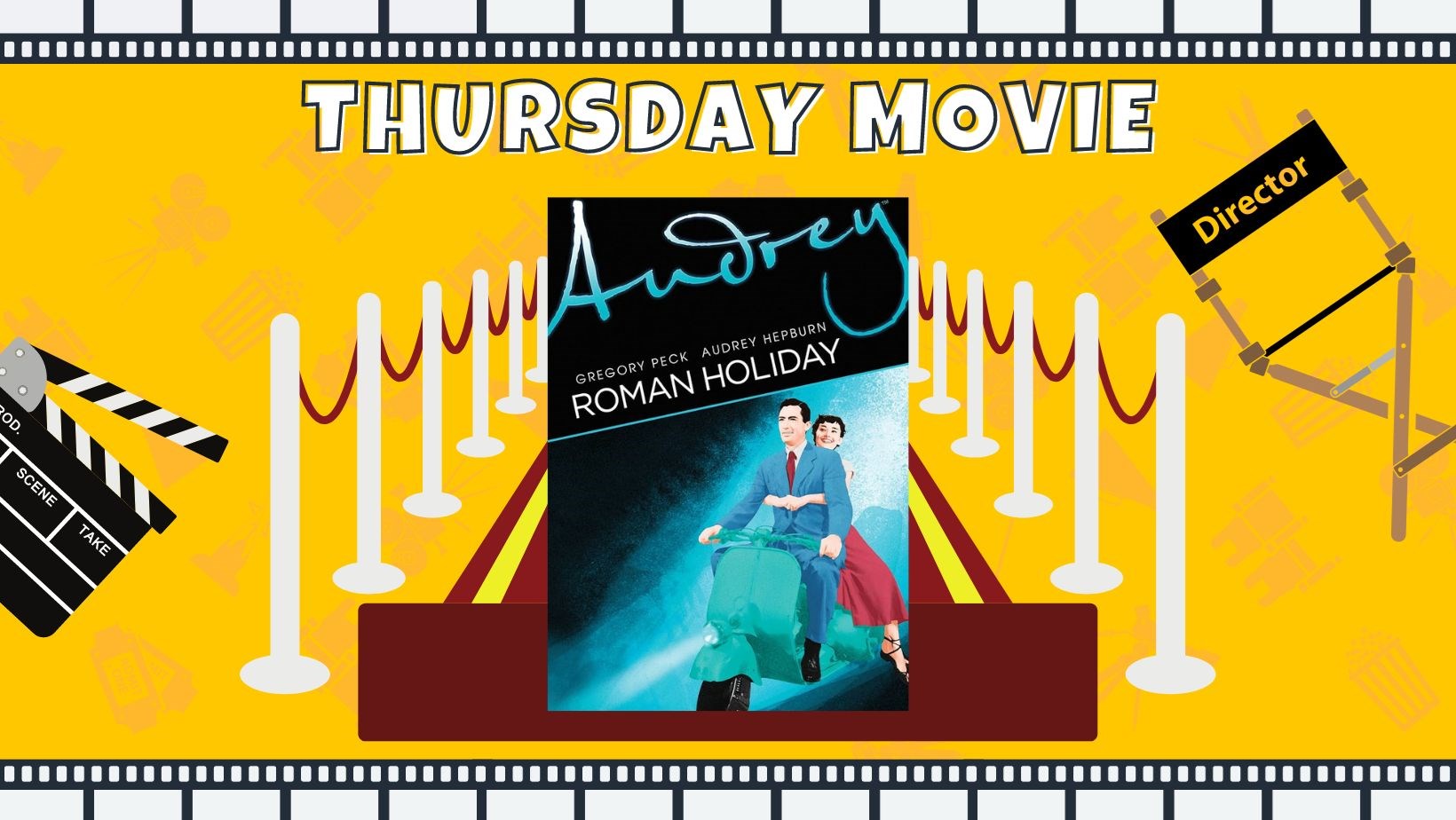 Join us for a showing of Roman Holiday (1953) rated G, 1 hour 58 minutes. Enjoy complimentary popcorn and snacks. |