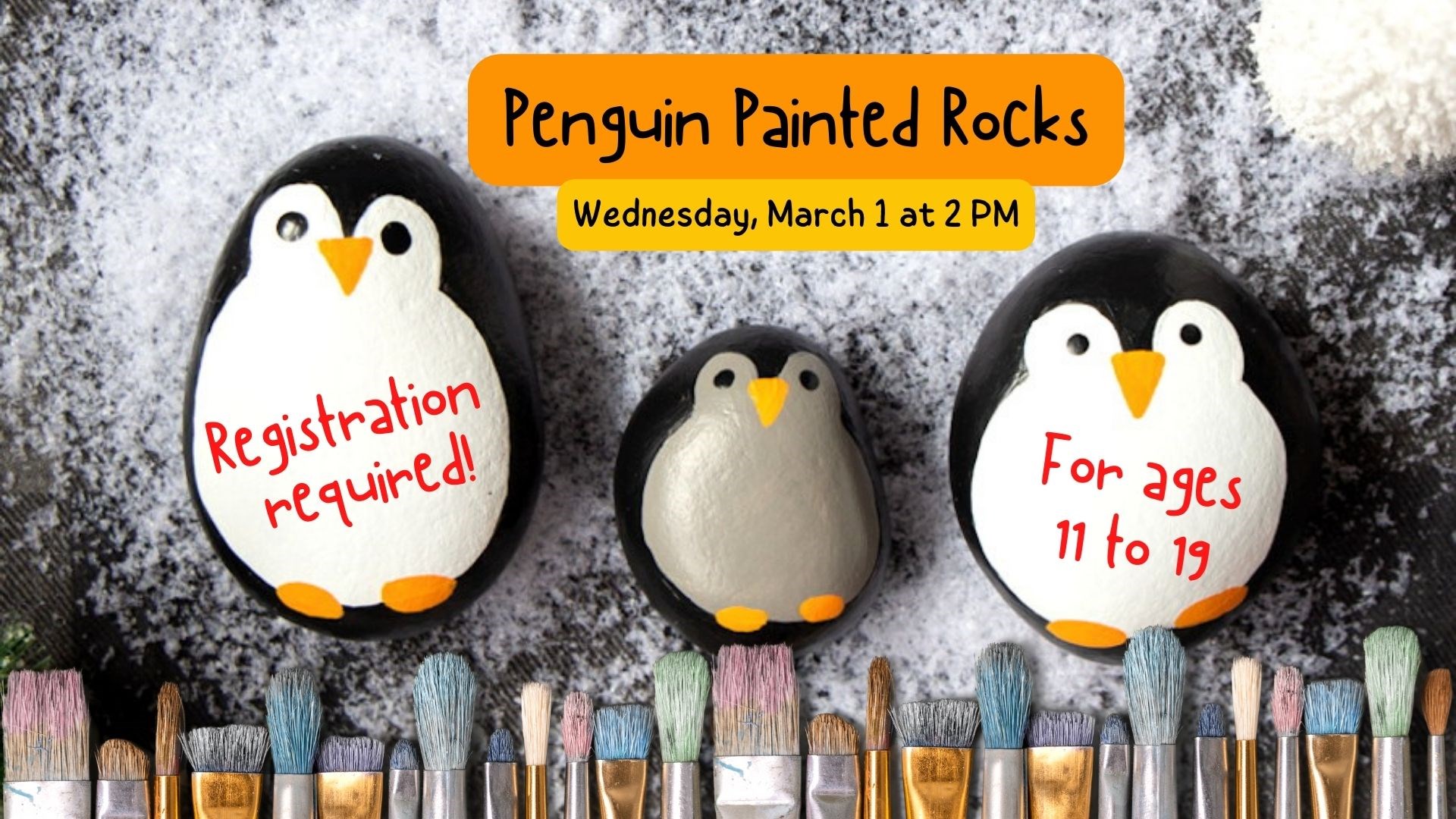 Tweens and teens are invited to this penguin painted rock program. We will provide the paint, paintbrushes, and rocks and show examples of completed designs. The rest is up to you! Registration is required for this program and opens on Wednesday, February 15 at 2 PM. |