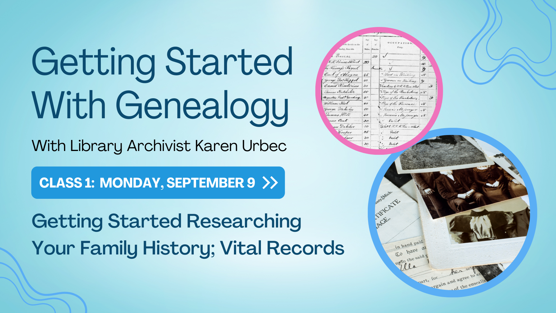 Classes will include a lecture with Library Archivist Karen Urbec, followed by a question-and-answer period, and time to practice your new research skills with the library’s genealogical resources. Class members are also encouraged to attend our Monday night Drop-In Genealogy sessions each week, to further sharpen their skills.
