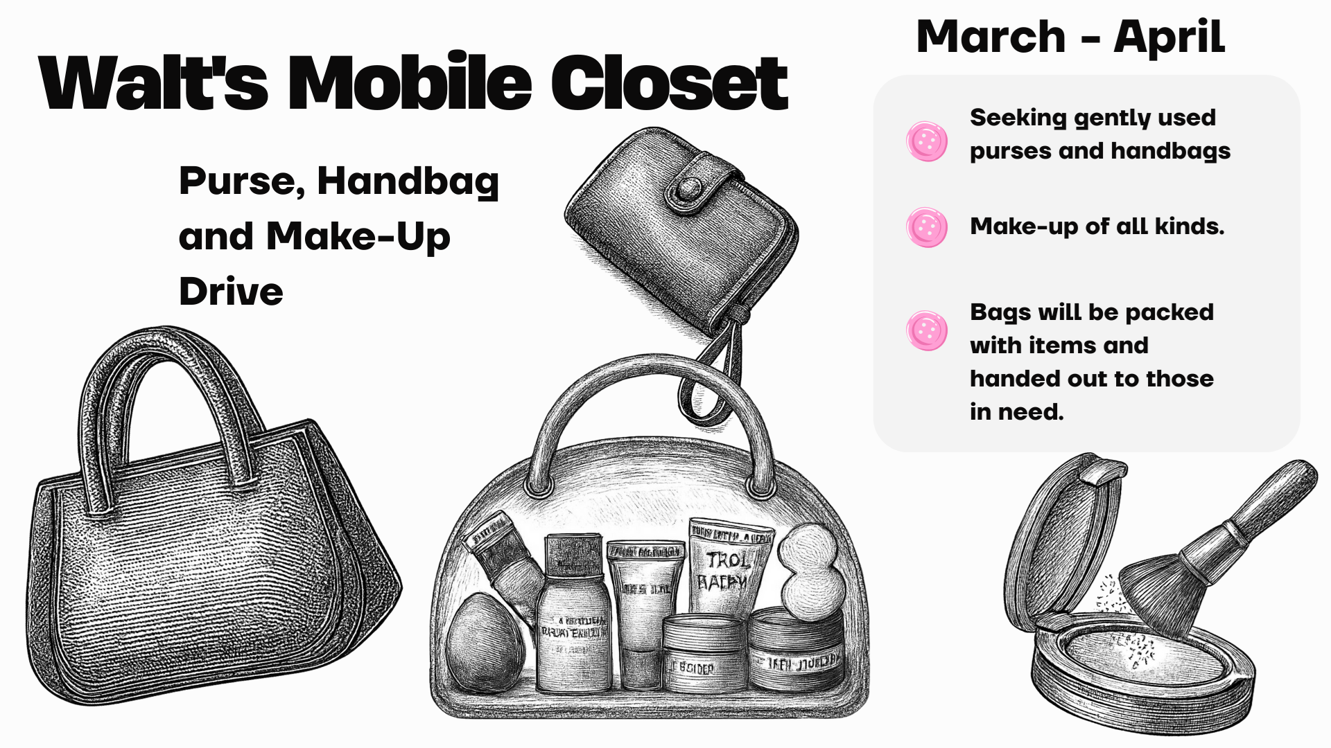 For the months of March and April, we are thrilled to once again, partner with Walt’s Mobile Closet and announce our Purse & Makeup Drive to support underserved women in our community!