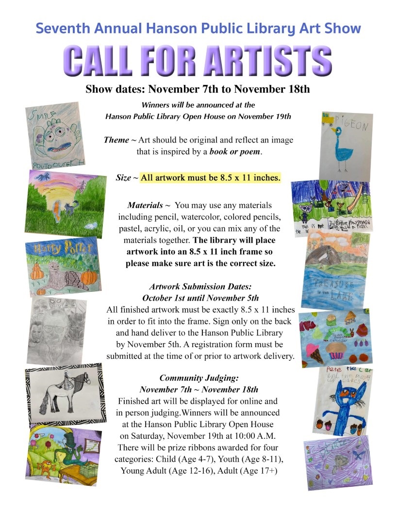 Show off your artistic talents and submit a masterpiece to the 7th Annual Hanson Public Library Art Show! Artwork can be submitted to the Library between October 1st to November 5th, and will be on display for online and community judging from November 7th to 18th. Winners will be announced at our Open House on November 19th. Art should be original and reflect an image inspired by a book or poem. All artwork must be 8.5 by 11 inches to fit in our display frames. There will be prize ribbons awarded for four categories: Child (Age 4-7), Youth (Age 8-11), Young Adult (Age 12-16), Adult (Age 17+)