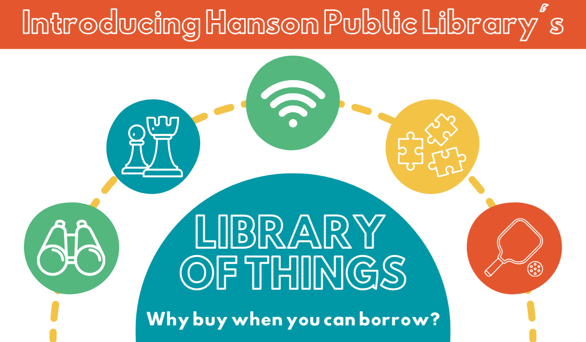 Why buy when you can borrow! Explore the Hanson Public Library’s new Library of Things, a collection of non-traditional items to help patrons learn, play, and grow! The collection includes Mobile Hotspots, Roku Streaming Sticks, Metal Detectors, Educational Kits, Yard Games, Board/Card Games, Jigsaw Puzzles, Cricut Joy, Tools, and more!