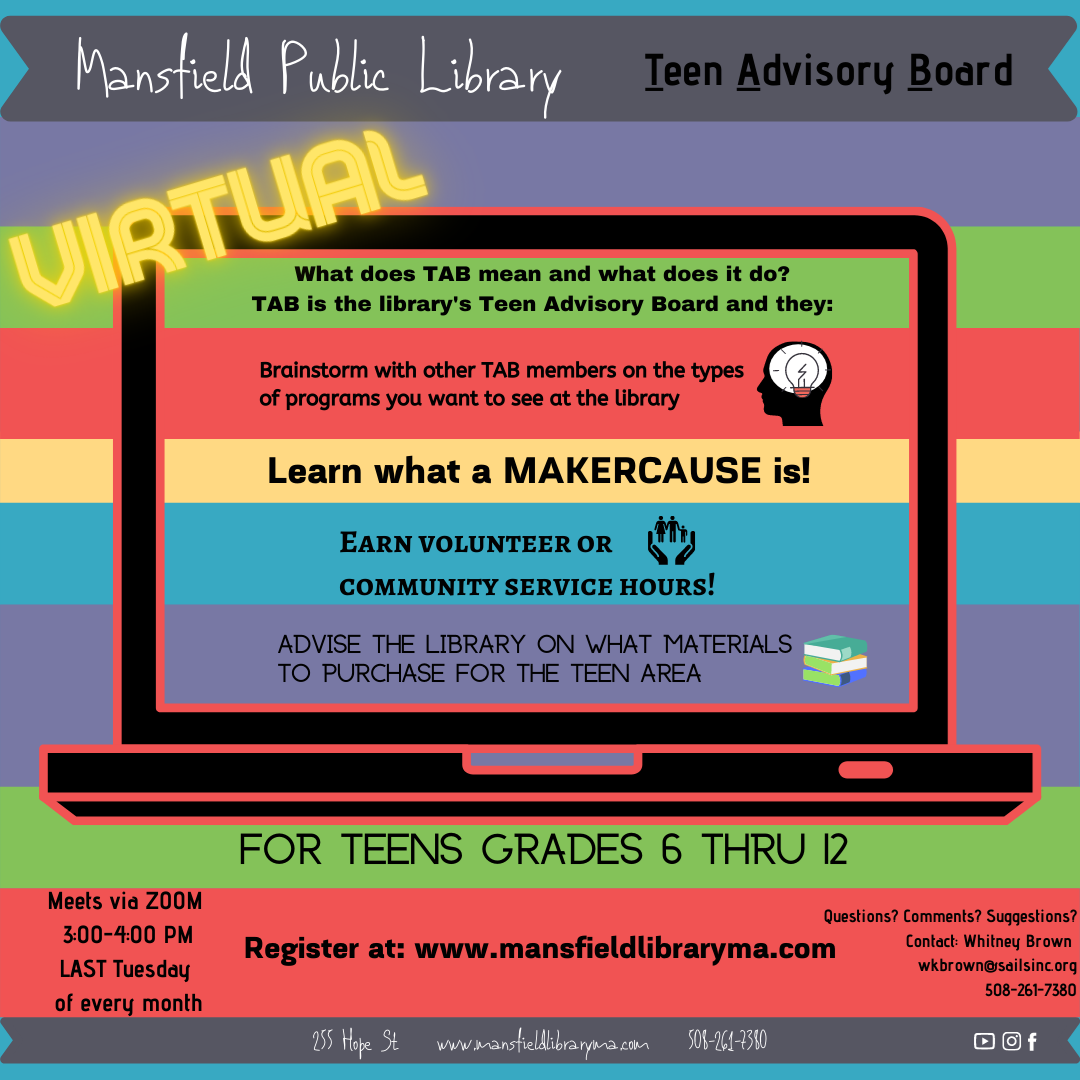 Virtual Teen Advisory Board Meeting Tuesday, January 25th, 3:30-4:15PMZoom Meeting Room Calling All Teens!!! The Mansfield Public Library is currently looking for teens in Grades 6 through 12 to be a part of the Teen Advisory Board! What does this mean? By joining the Teen Advisory Board, teens will have the opportunity to earn volunteer/community service hours, advise the library on what materials to purchase for the Young Adult area, come up with ideas for virtual programs to have at the library, learn about our MAKERCAUSE and much, much more!!! Registration Required for invitation to Zoom Meeting Room. Registrants will receive the invitation to the Zoom Meeting Room on the day of the event.