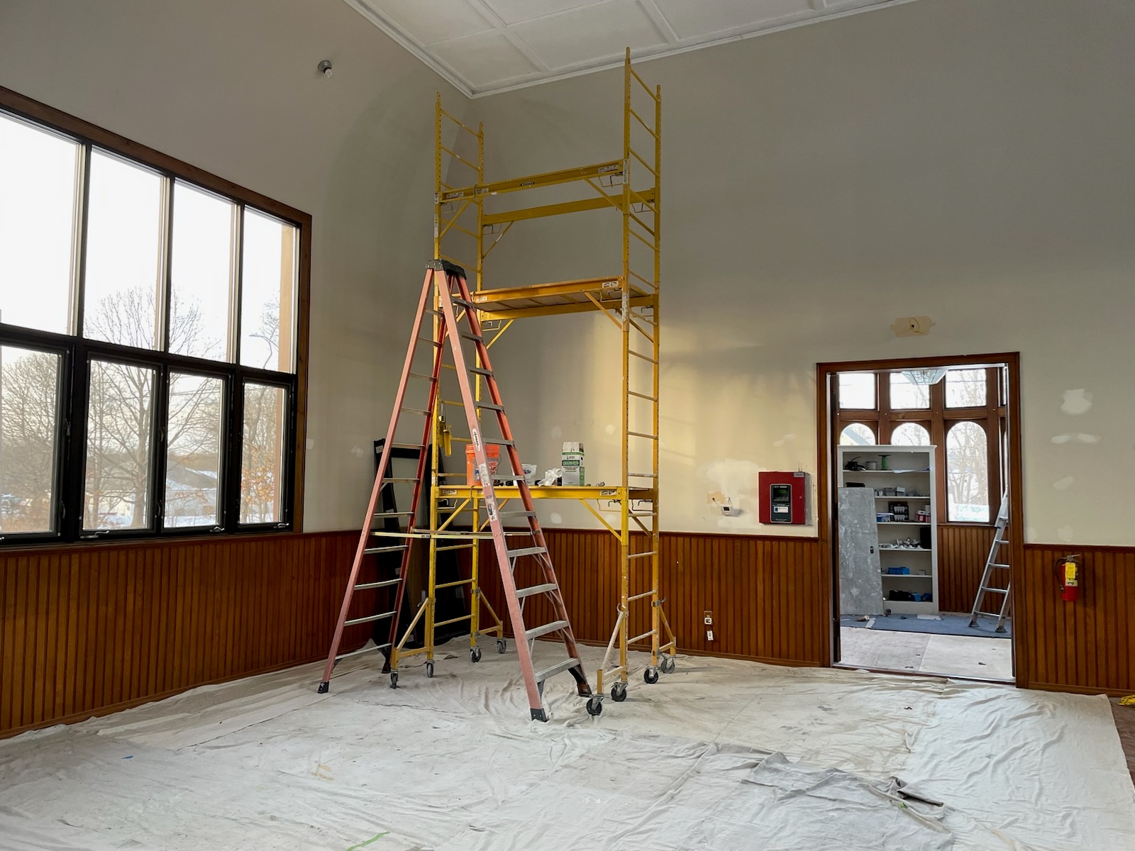 The scaffolding, ladders, and floor coverings can only mean one thing! Painting of the interior walls and ceilings began last week.