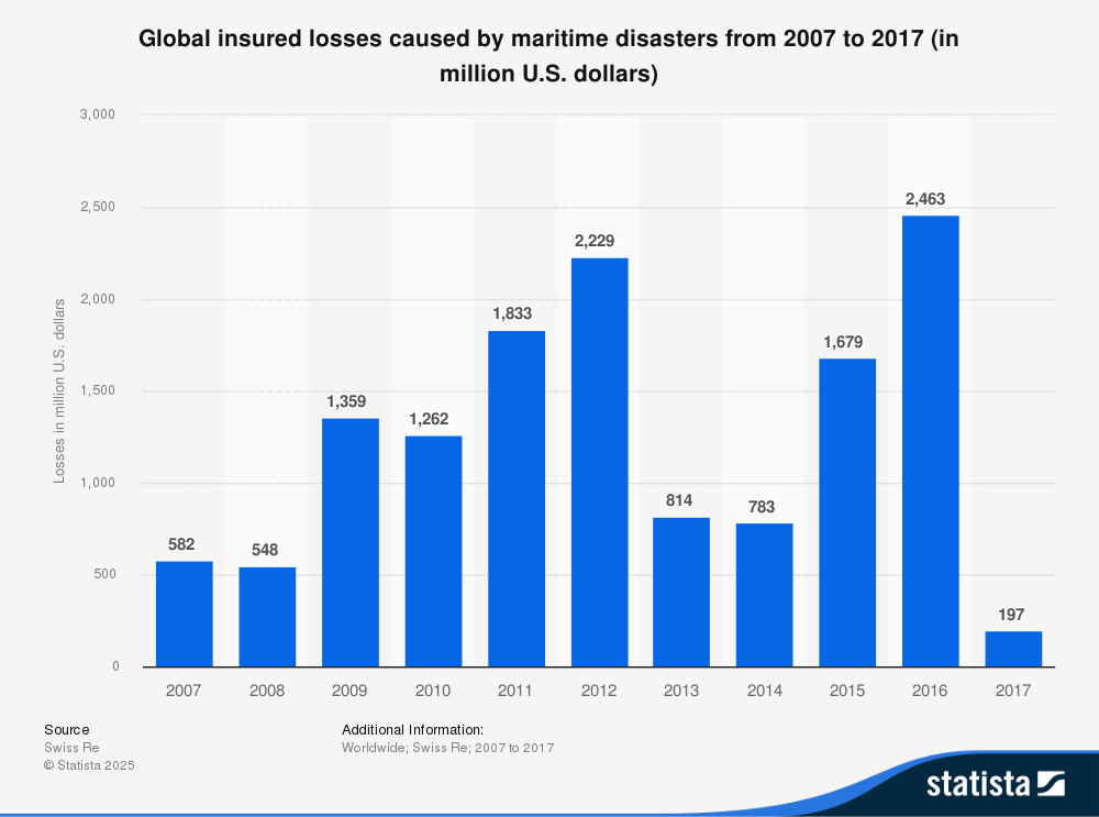 Global insured losses caused by maritime disasters from 2007 to 2017