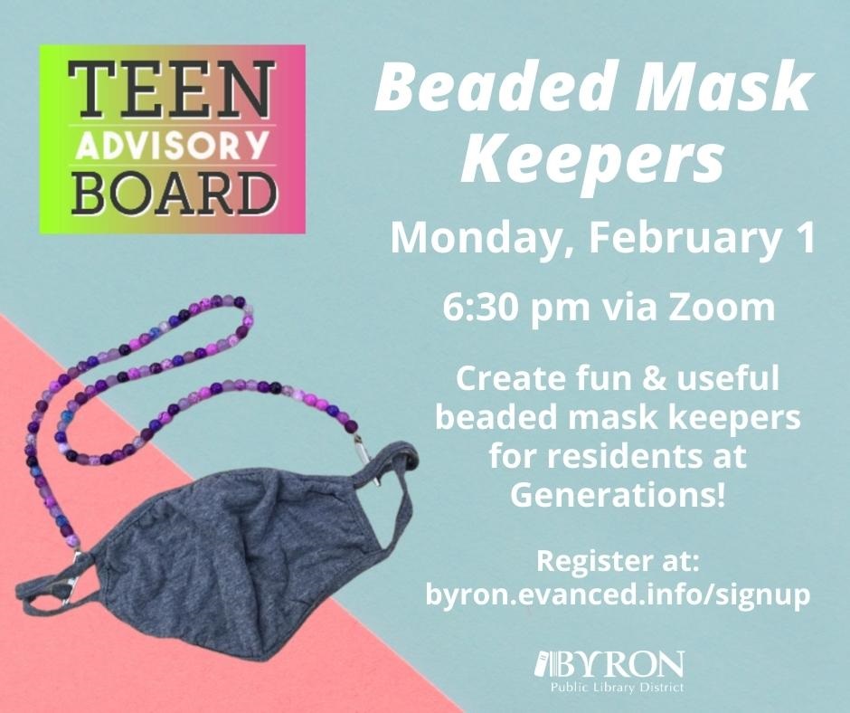 Beaded Mask Keepers Make beaded mask keepers for seniors at Generations. Inspired by beaded eyeglasses chains, these lanyards will keep their masks clean and prevent them from being misplaced. Supply kits will be available on Friday, January 29th. We will meet on Zoom to create together on February 1st. |