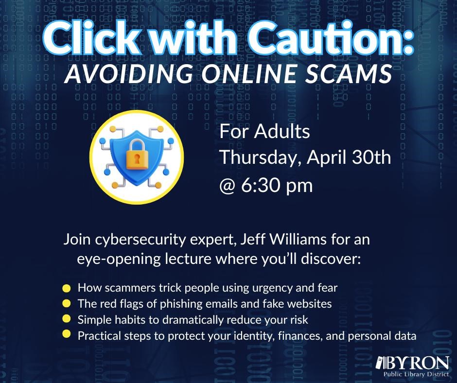Click with Caution: Avoiding Scams | Thursday, April 30, 2026 6:30pm - 7:30pm |