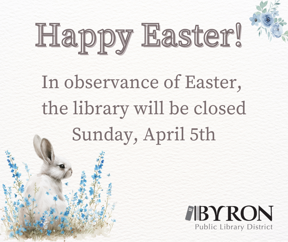 The library will be closed on Sunday, April 5, 2026 in observance of Easter. We will reopen on Monday, April 6, 2026 at 9:00am. We want to wish all of our patrons a very Happy Easter!