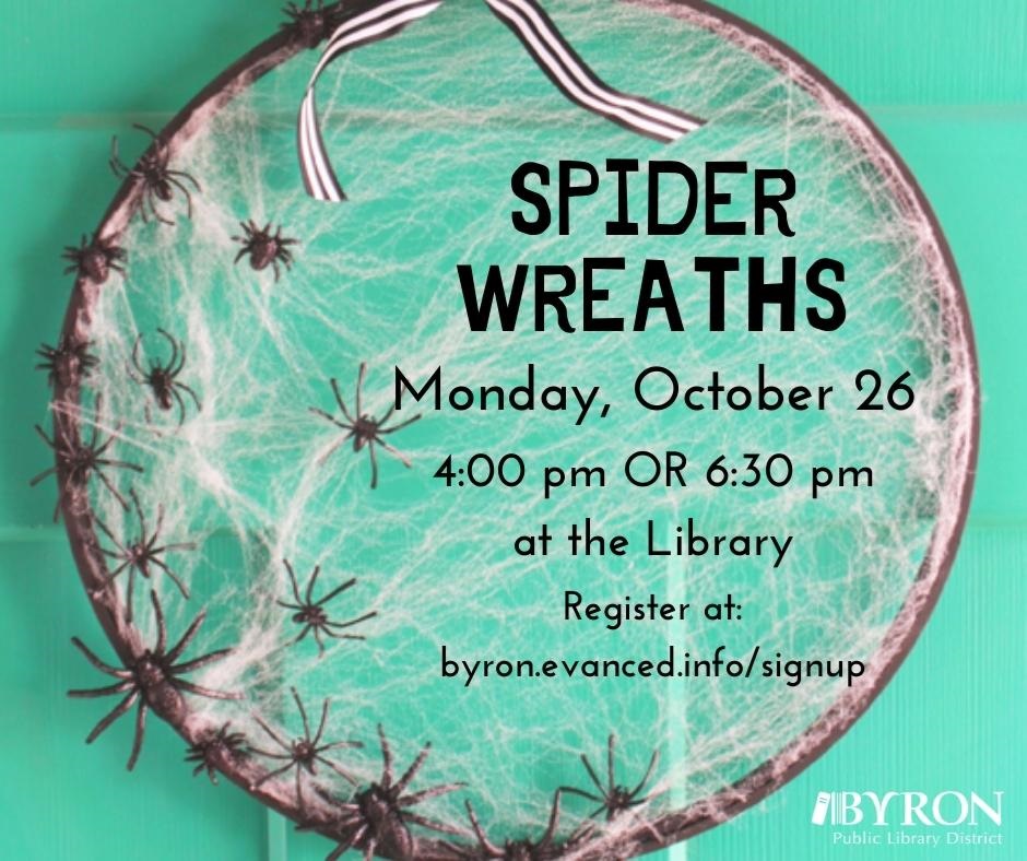 Create an amazing Spider Wreath decoration at the library on Monday, October 26th! Registration required.