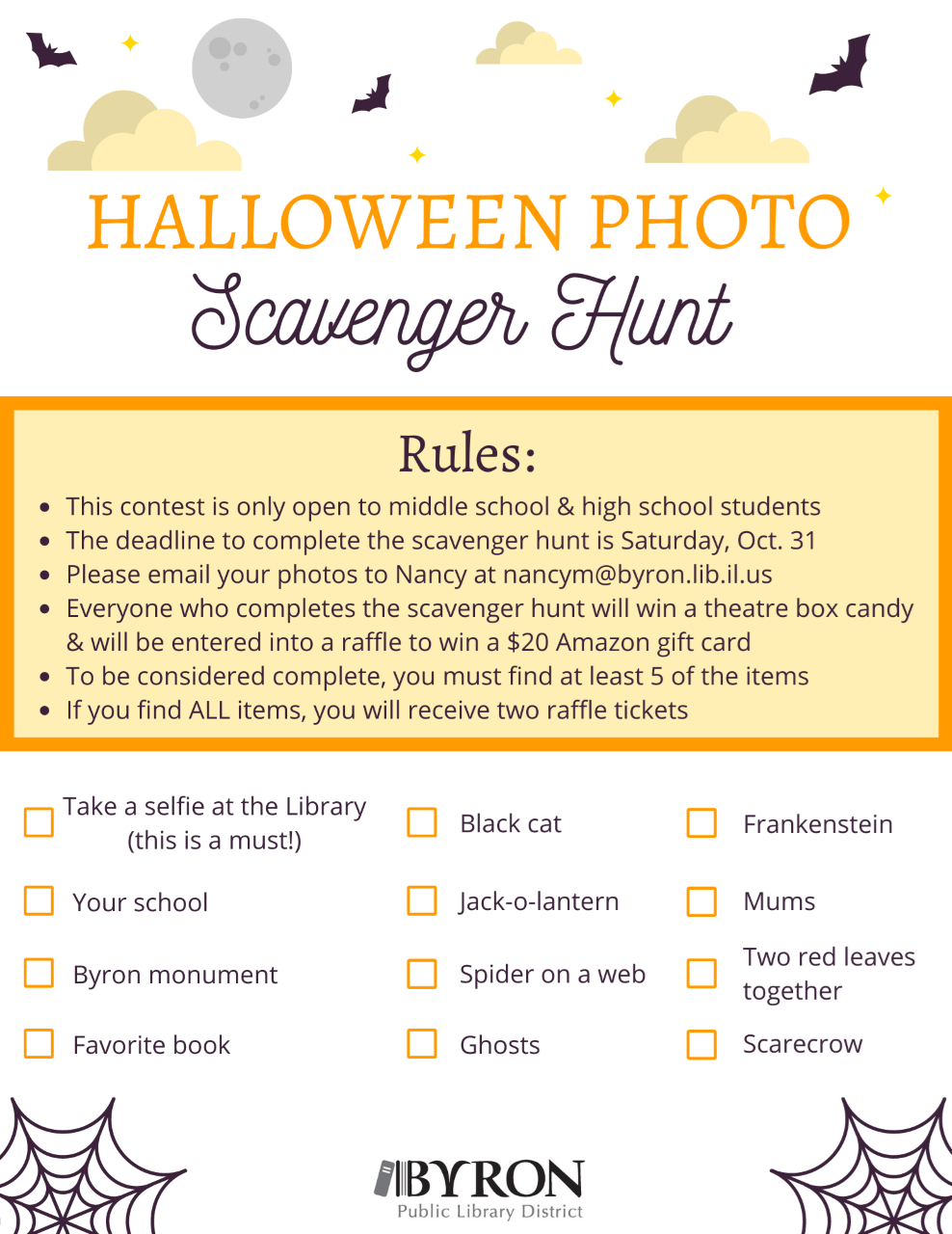 gift card by participating in a Halloween Photo Scavenger Hunt! You have until the end of October to complete and email Nancy your photos. Copy off the computer or pick up a paper copy at the circulation desk.