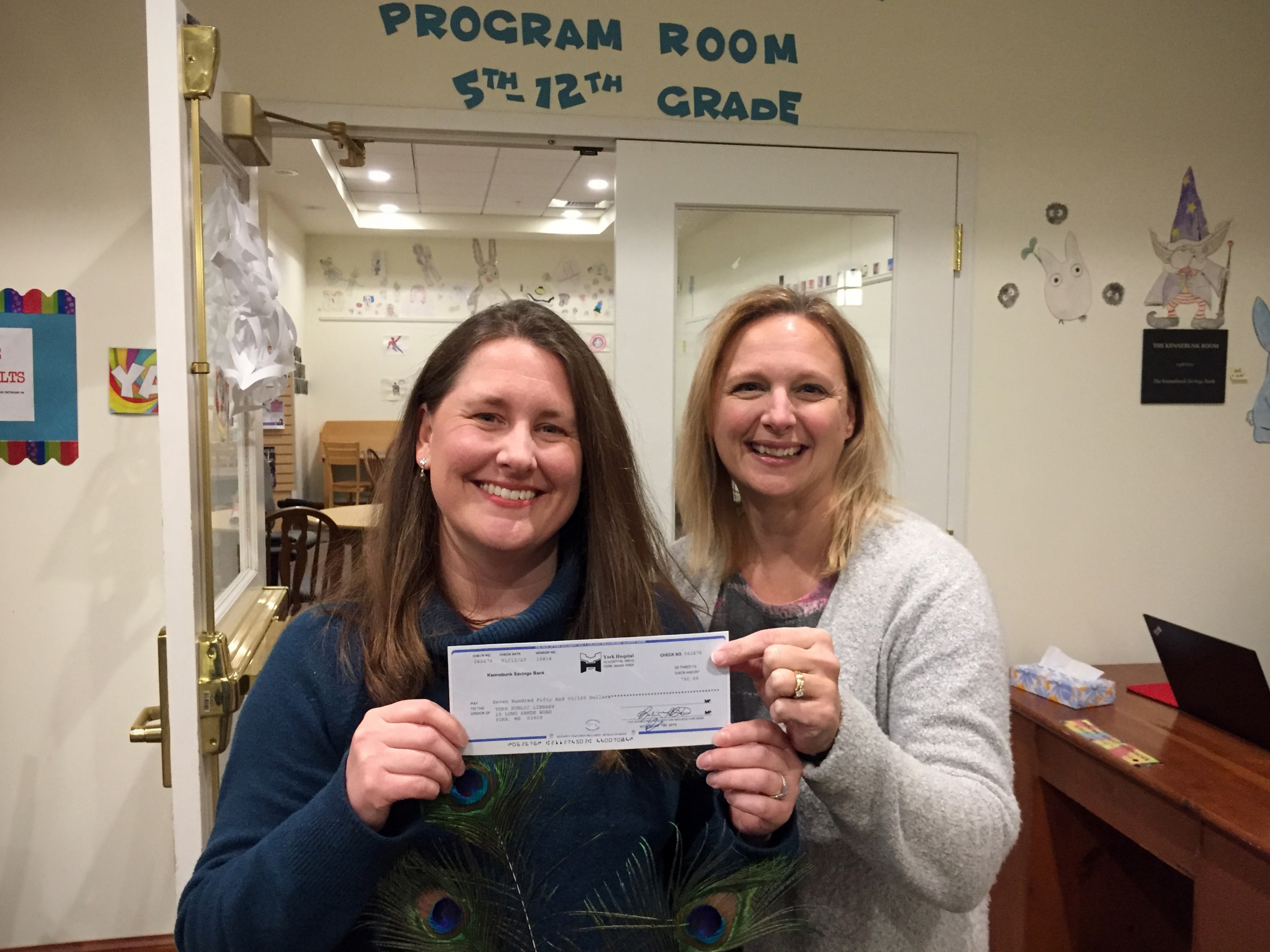 PHOTO: YA Librarians Katie Arey and Barb Bourgoine hold the check from the Choose to Be Healthy Coalition which provided funding for a variety of items to help students de-stress during midterm week.