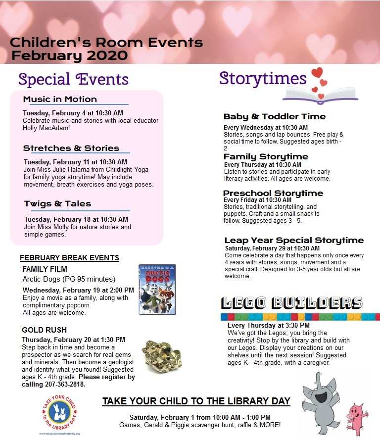 Community Crafters Thursdays, February 6, 13, 20, 27 from 10:30 –Noon Join us in the Kennebunk Room each Thursday morning to knit, crochet, do needlework or whatever other creative endeavor you are working on. The Library will provide the space to work and socialize; you just need to bring along your own project.