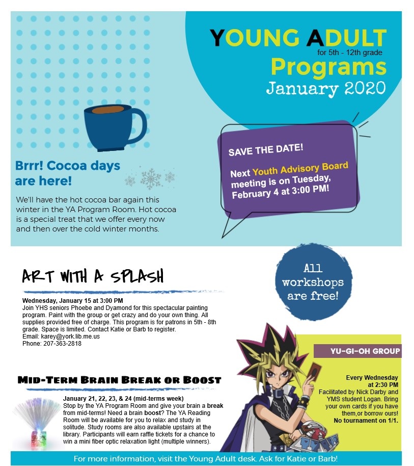 Community Crafters Thursdays, January 2, 9, 16, 23, 30 10:30 –Noon Join us in the Kennebunk Room each Thursday morning to knit, crochet, do needlework or whatever other creative endeavor you are working on. The Library will provide the space to work and socialize; you just need to bring along your own project.