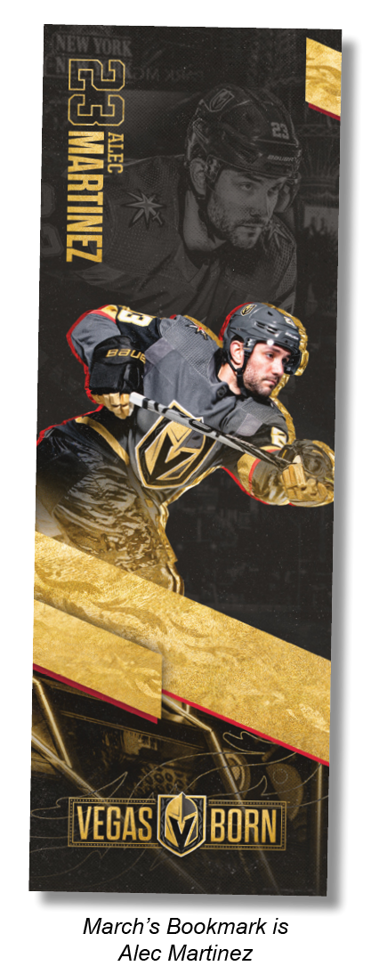 The start of a new month means a new Vegas Golden Knights free collectible bookmark to pick up at your neighborhood branch. The Library District continues its partnership in literacy with the Vegas Golden Knights with the launch of the team’s 2021 bookmark series. There is a new spotlighted player each month, and March is Defenseman Alec Martinez.