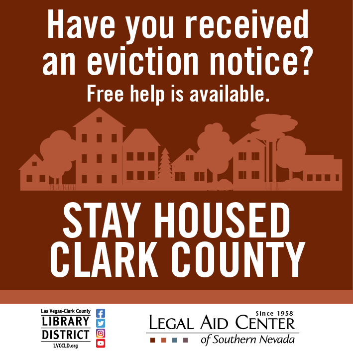 Stay Housed Clark County Tenants who have received an eviction notice can get free legal assistance from Legal Aid Center of Southern Nevada at these two Library District locations. Service will be provided on a first-come, first-served basis. Be sure to bring your eviction notice.