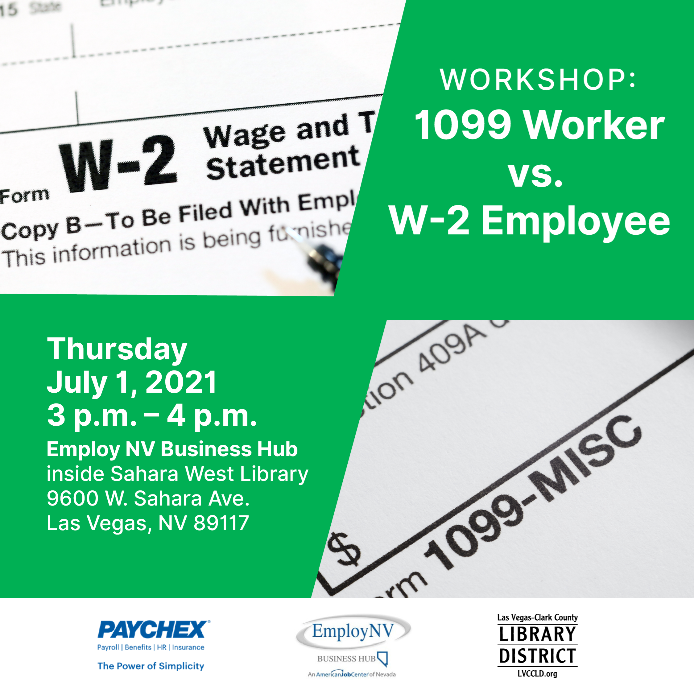 Knowing the Difference Are your workers W-2 employees or W-9 contractors? There are major differences between these classifications and it's important to get this right for IRS. This workshop will be held on Thursday, July 1, 2021 from 3 p.m. - 4 p.m. at the Employ NV Business Hub inside the Sahara West Library. You will learn everything you need to know to get it right from now on.