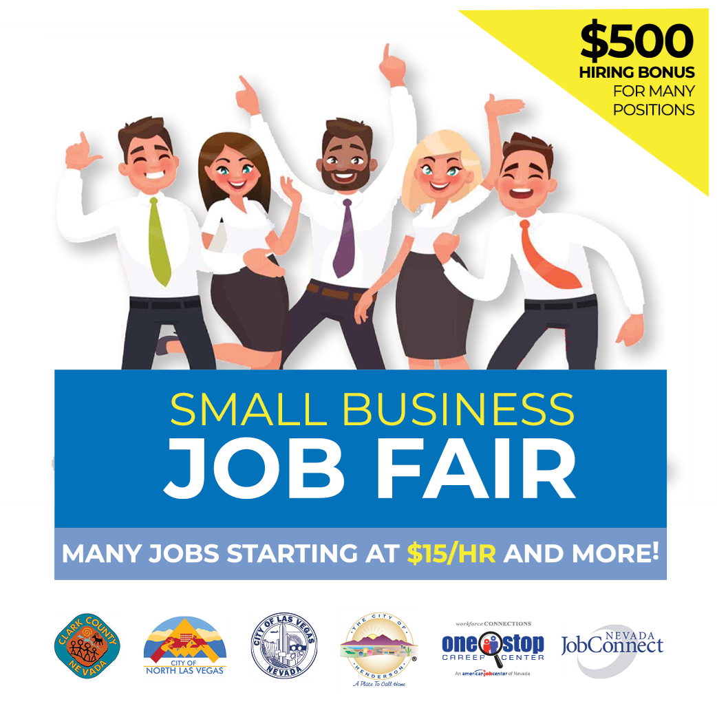 Get Your Career Rolling at the Small Business Job FairIf you have been looking for a route back into the workforce, don’t miss this opportunity! Employers will be on-site and looking for the right candidate, so dress for success and bring your updated resume. Many jobs start at $15/hour and there is a $500 hiring bonus for many positions. The event takes place on Saturday, November 6 from 9 a.m. - 2 p.m. at the Expo at World Market Center, located at 435 Grand Central Parkway. Click HERE to register.
