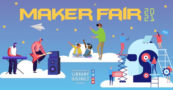 Be a Maker and Join Us for Maker Fair 2021 Don't miss this fun, educational annual event on Wednesday, August 25 from 3 p.m. - 6 p.m. at West Las Vegas Library. Kids and adults are all invited to get hands-on experience learning about music production, robotics, 3D printing, virtual reality, arts & crafts, and much, much more. Click HERE for details or call 702.507.3983.