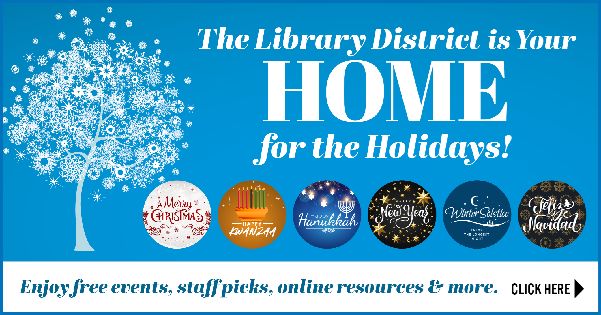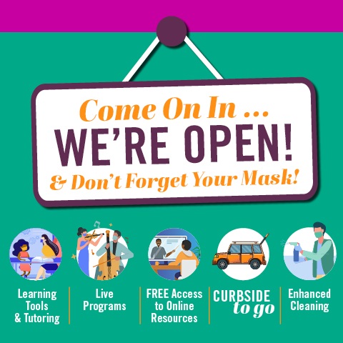 Open + Safe + Clean! The library is always here for you – in person, curbside, or online – whatever works best for you! Of course, we hope you will come in to visit us at one of our clean and safe library branches during the holiday season. Enjoy our festive live events or browse for your next DVD, CD, or book. We are continuing our enhanced cleaning services and face coverings are required to ensure everyone’s safety.
