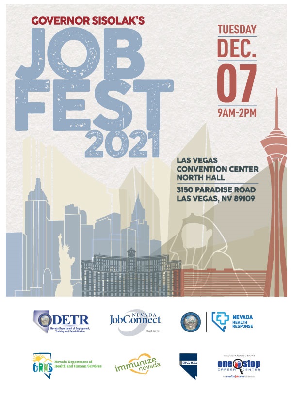 Find Jobs & More at JobFest 2021 on December 7 Prepare yourself for a successful job search at Governor Sisolak’s JobFest 2021. Dress for potential interviews and bring your resume as there will be 100 employers on site and ready to hire for thousands of jobs! Stop by the Las Vegas Convention Center, North Hall, located at 3150 Paradise Rd., Las Vegas, 89109, on Tuesday, December 7 from 9 a.m. - 2 p.m., where you will find free employment and job training opportunities, help with a career change, plus COVID-19 and flu vaccines, and assistance with housing, childcare, and other resources. To register, please click HERE.