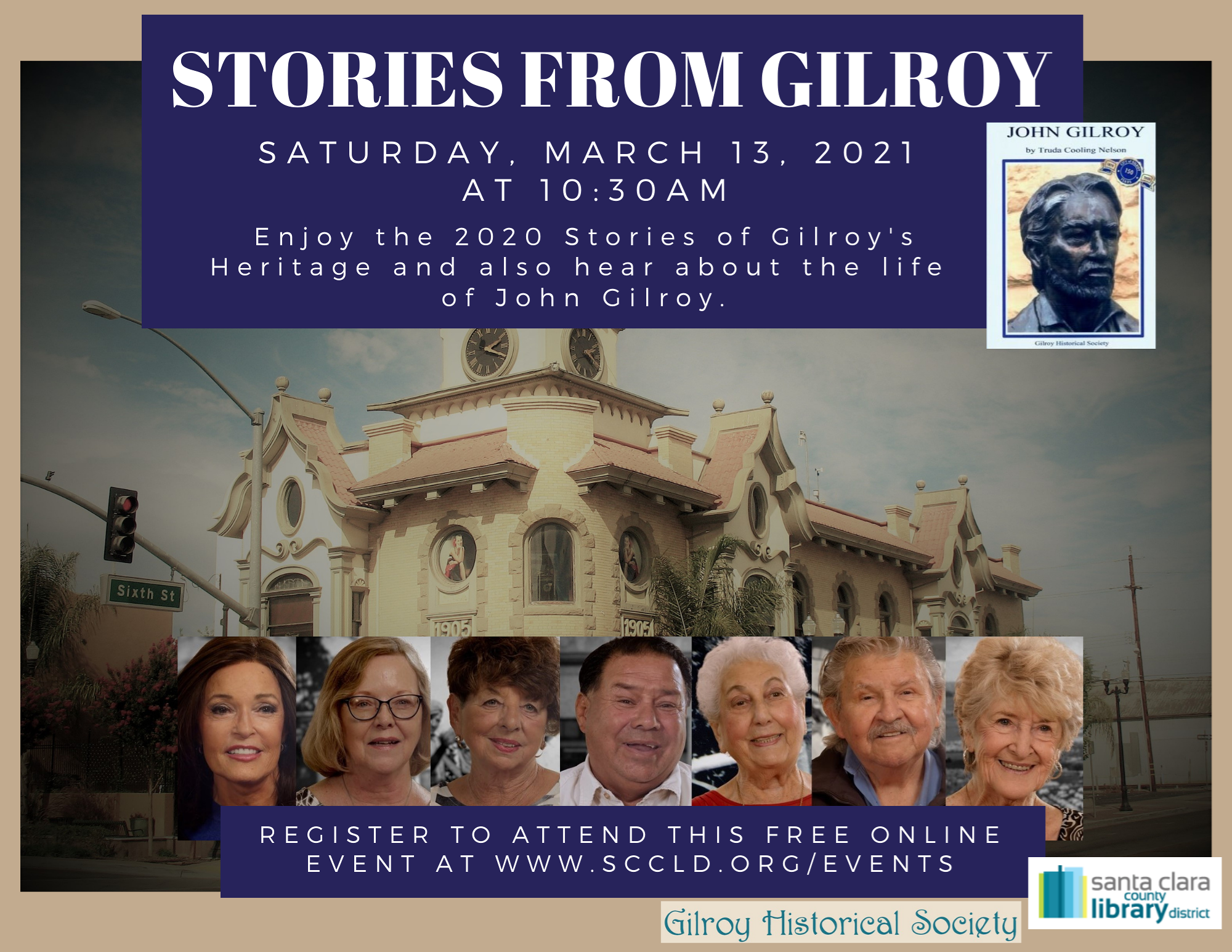 Stories From Gilroy: Local History Presentation Immerse yourself in the history of Gilroy on Saturday, March 13. Join us for a film presentation, 2020 Stories of Gilroy’s Heritage, which captures the oral history of community members born in the 1930s and 1940s. Following the film there will be a Q&A with the film's producer and the Gilroy Historical Society. Also learn about a new biography about the city's namesake, John Gilroy.