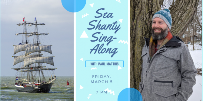 Virtual Sea Shanty Sing-Along We’re hosting a fun family-friendly event this Friday at 7:30 p.m. Join musician Paul Matthis for a Sea Shanty Sing-Along on Zoom! We will put the lyrics up on the screen and provide the music for you to sing along at home!
