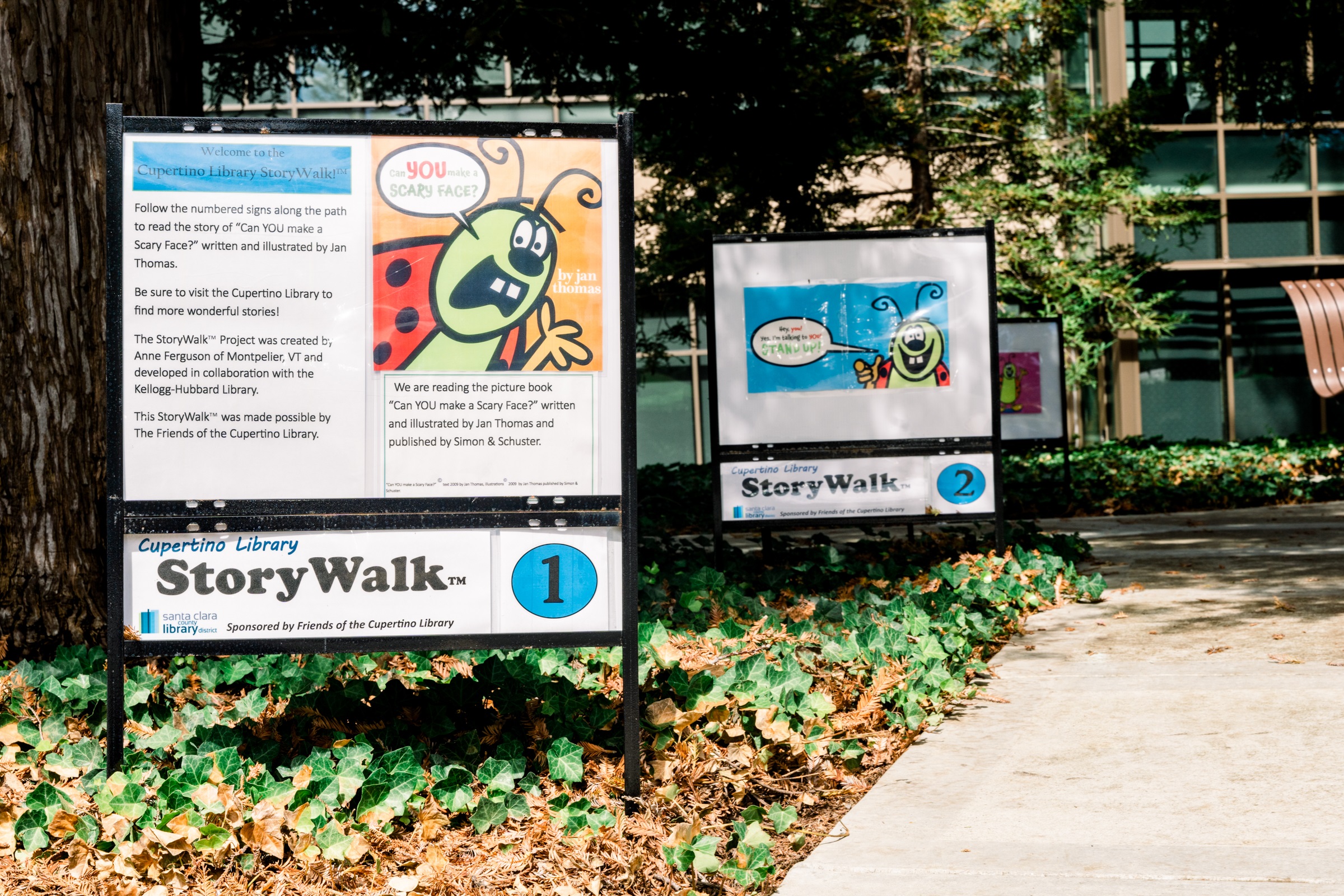 Check Out the Cupertino Library StoryWalk! If you haven’t seen it yet, we invite patrons to check out the StoryWalk® at Cupertino Library. Similar to the one at the Campbell Express Library, these StoryWalks® include pages taken directly from a children’s book, mounted and installed along an outdoor path. As you walk the path, you are encouraged to read and follow the story along the way. Patrons will be delighted to see the book, Can You Make a Scary Face? by Jan Thomas. The StoryWalk® runs along the path under the redwood trees on the south side of the library. The starting point is near the Torre Avenue side of the path. Thank you to the Friends of the Cupertino Library for generously sponsoring the StoryWalk®. StoryWalk® was created by Anne Ferguson of Montpelier, VT and developed in collaboration with the Kellogg-Hubbard Library in Vermont.