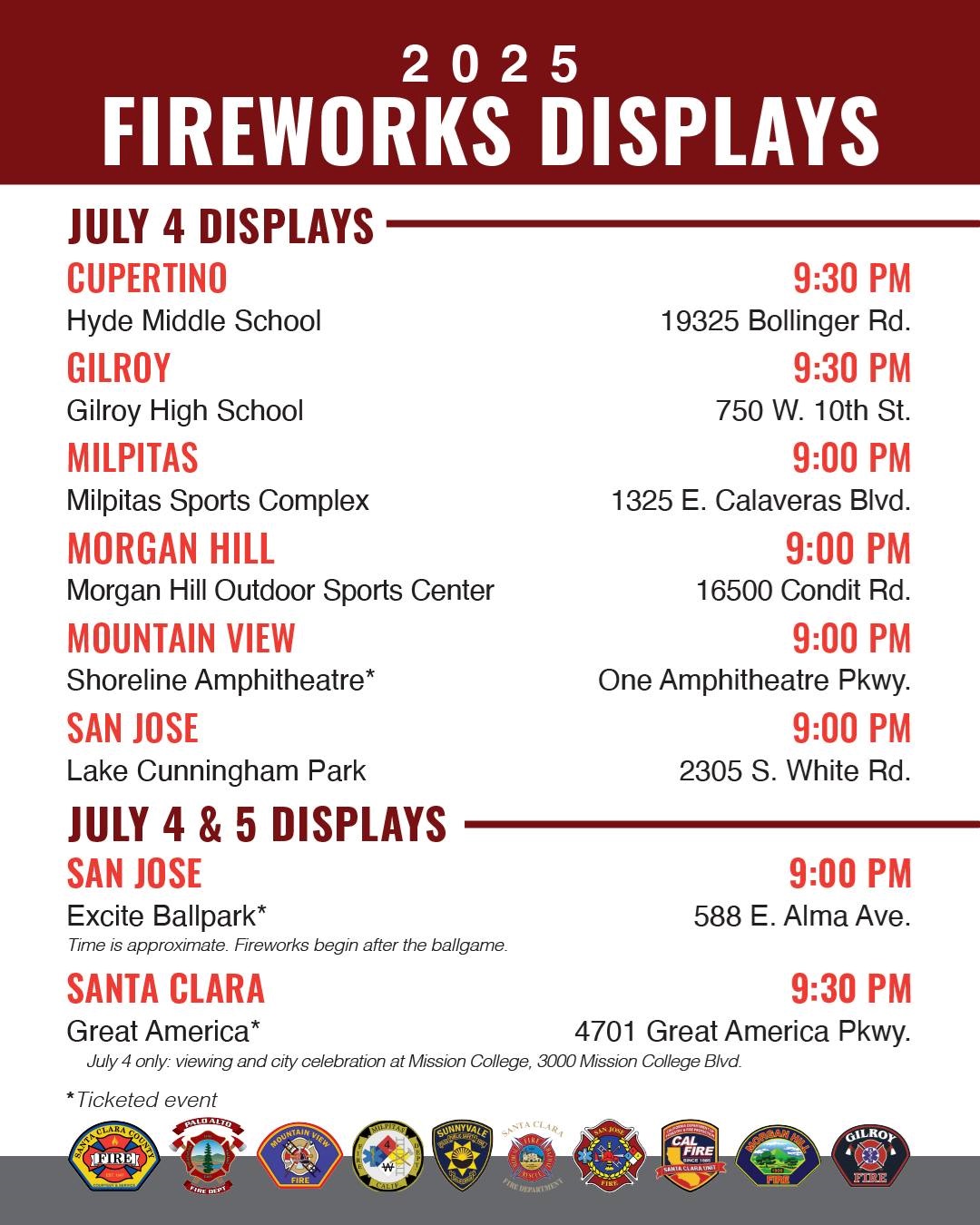 Celebrate the 4th of July Safely According to the Santa Clara County Fire Department, the safest and most effective way to prevent fireworks-related injuries is to leave all fireworks displays to trained professionals and attend an outdoor public display if available. Take a look at the upcoming shows. Have a happy and safe Independence Day! |