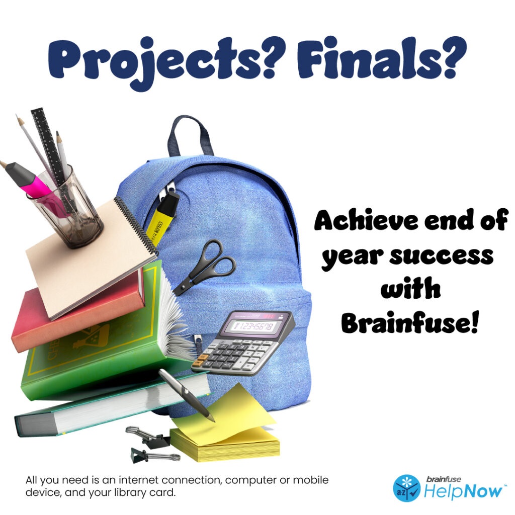 Student eResource: HelpNow by Brainfuse The end of the school year means projects are due and finals are coming up! Studying for exams can be tough, but it’s important to remember that there’s always help available. Try our free eResource, Brainfuse HelpNow. Get homework help on any subject with an online tutor from 1 – 10 p.m. any day of the week. Tutors are also available in Spanish. Additional services include study resources and test prep, create and share flashcards, and virtual study rooms.