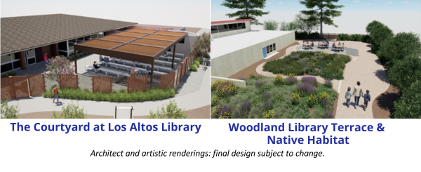 New Outdoor Space Coming to Woodland Library We are excited to announce a vibrant new outdoor space is being added to Woodland Library. The Woodland Library Terrace and Native Habitat, adjacent to the library, offers a welcoming space to read, study and gather. The project includes shaded eating areas with tables and umbrellas, surfaces for games and chalk activities, and a beautiful native garden designed and created by GreenTown Los Altos. Work on the Woodland Library Terrace is underway and is expected to be completed this summer. The library will remain open during regular service hours. The City of Los Altos, with generous funding from LALE are spearheading the Woodland Library Terrace project. The Santa Clara County Library District is grateful for this City project.