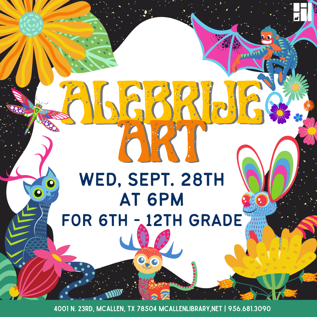 Teen Programs Program Highlight: Alebrije Art Wednesday, September 28th at 6PM Let's celebrate Hispanic Heritage Month by painting our own bright and whimsical alebrijes! Learn more about this popular and traditional Mexican Folk art!