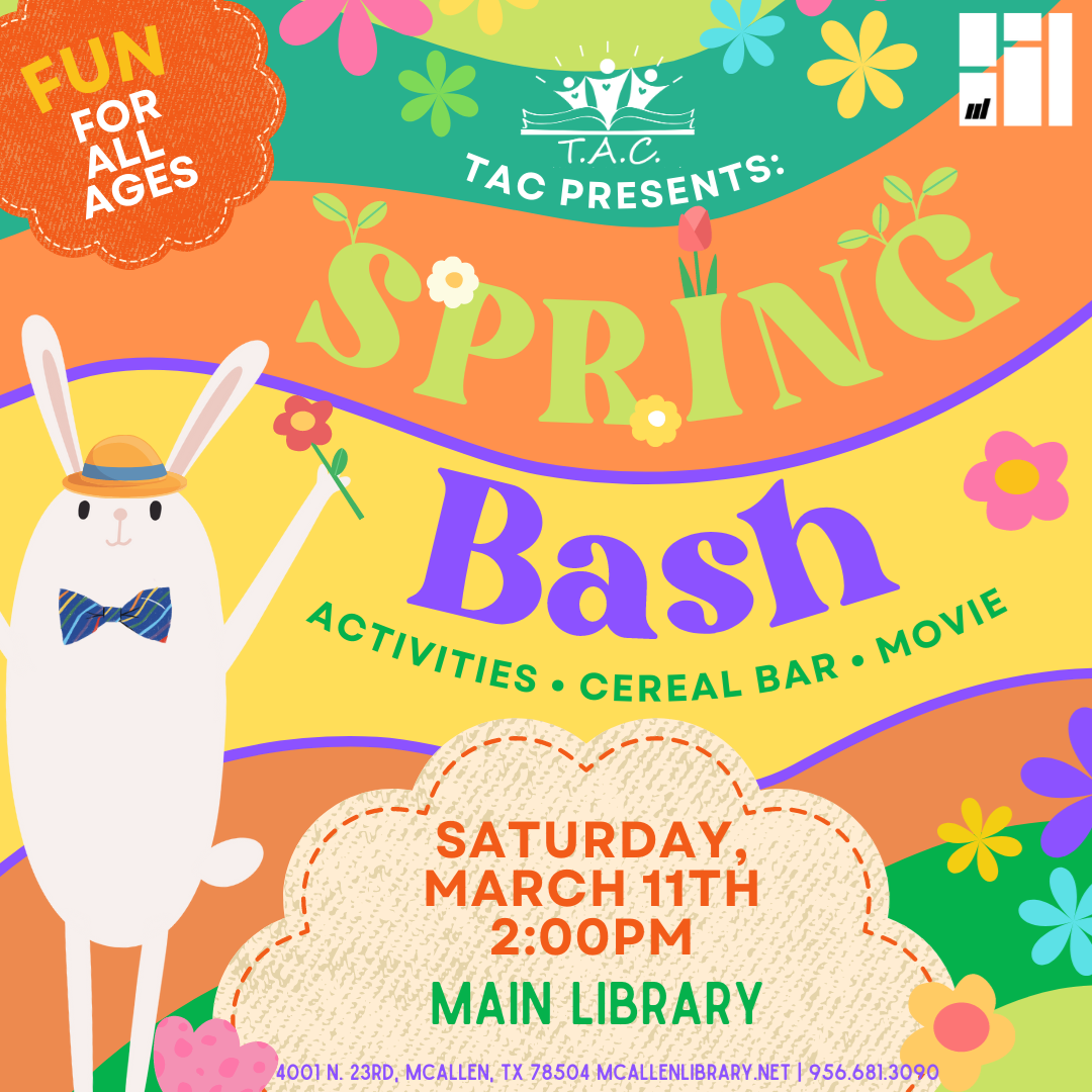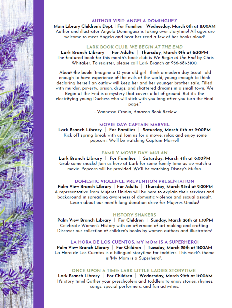 Children's Programs Toddler Time March 2nd, 9th, 23rd & 30th at 10AM Saturday Storytime March 4th & 18th at 11AM Baby Storytime March 5th, 6th, 20th, & 27th at 1PM Family Storytime March 7th, 21st, & 28th at 6:30PM Coloring Day (Lark) March 6th at 6PM Once Upon a Time (Lark) March 1st, 6th, 7th, 8th, 16th, 20th, 21st, 22nd, 23rd, 27th, 28th, 29th & 30th at 11AM Crafty Kids (Lark) March 1st, 8th, 2nd & 29th at 6PM Storytime with author Elizabeth Garza (Lark) March 13h at 11AM Kids Lego Club (Lark) March 27th at 6PM Stay & Create (Palm View) March 6th, 8th, 20th, & 22nd at 5PM La Hora de los Cuentos: Bilingual Storytime (Palm View) March 7th, 21st, & 28th at 11AM Toddler Time (Palm View) Thursdays at 11AM