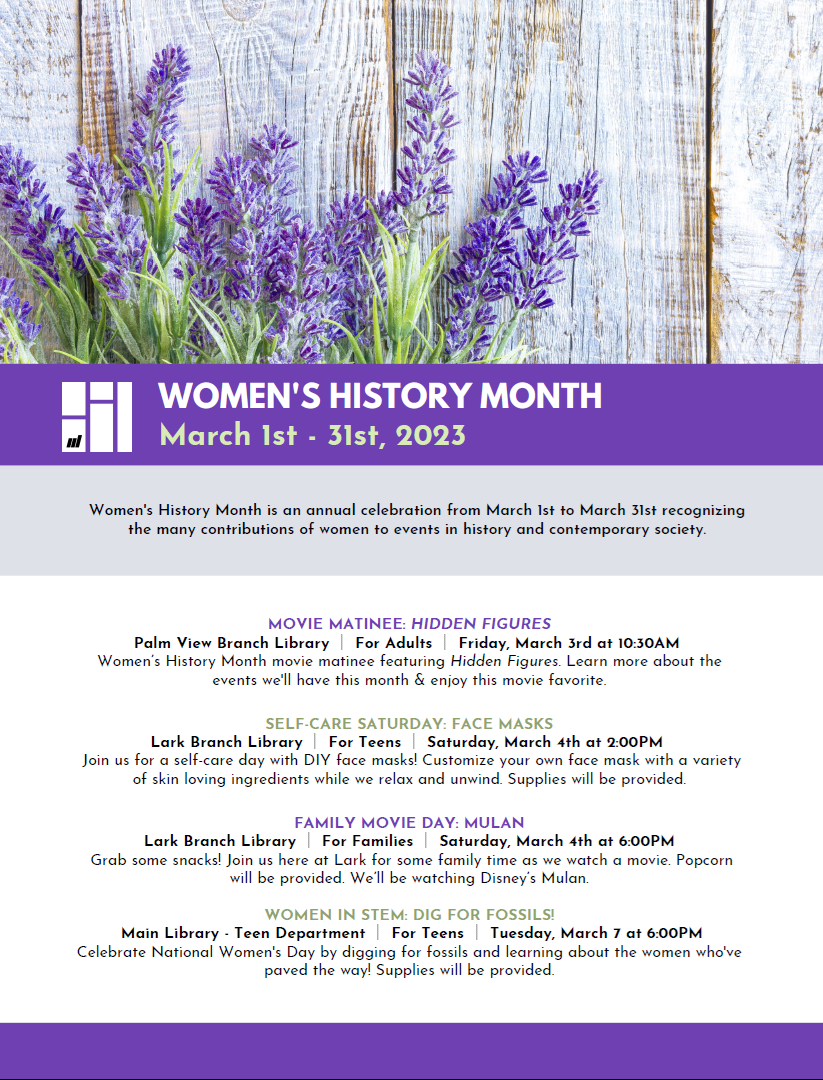 Adult Programs Region One ESL + Citizenship Class Mondays & Wednesdays at 9AM Coffee and Crafts March 1st at 3PM MPL Gaming Club March 14th & 28th at 5:30PM Tech Help (Lark) Saturdays at 10AM at 2PM Knitting Group (Lark) March 7th, 21st, & 28 at 2PM Adult Sketching Class (Lark) March 7th & 21st at 6PM Adult Coloring (Lark) March 8th at 6PM St. Patrick’s Craft (Lark) March 16th at 6PM Virtual Painting Class (Lark) March 17th at 2PM Painting Class (Lark) March 18th at 1:30PM Basic Computer Skills for Beginner (Lark) March 23rd at 6PM Basic Computer Class (Palm View) March 1st, 8th, 22nd, & 29th at 6PM Movie Matinee (Palm View) March 3rd at 6PM Tech Help (Palm View) March 4th, 11th, & 25th at 10:30AM Domestic Violence Prevention Presentation by Mujeres Unidas (Palm View)
