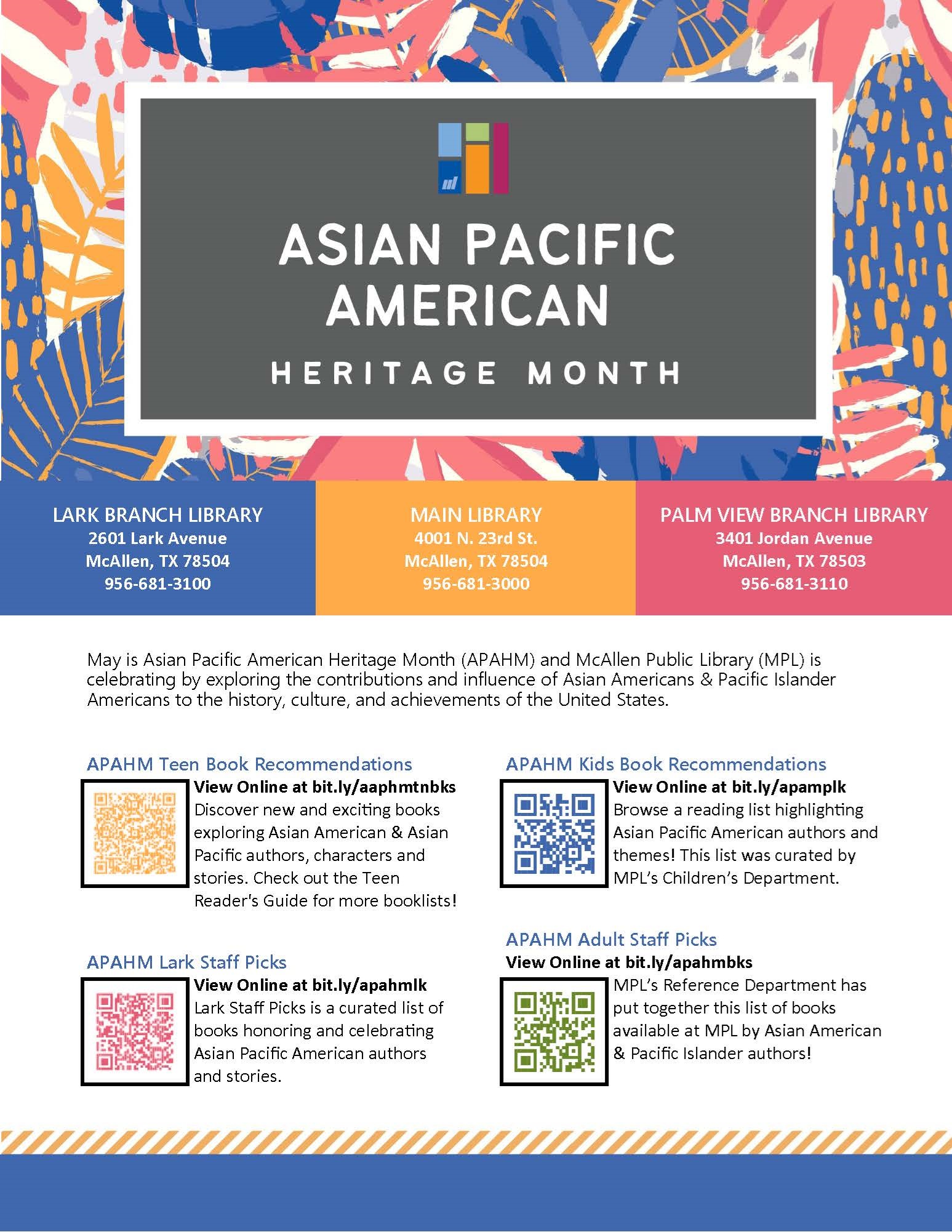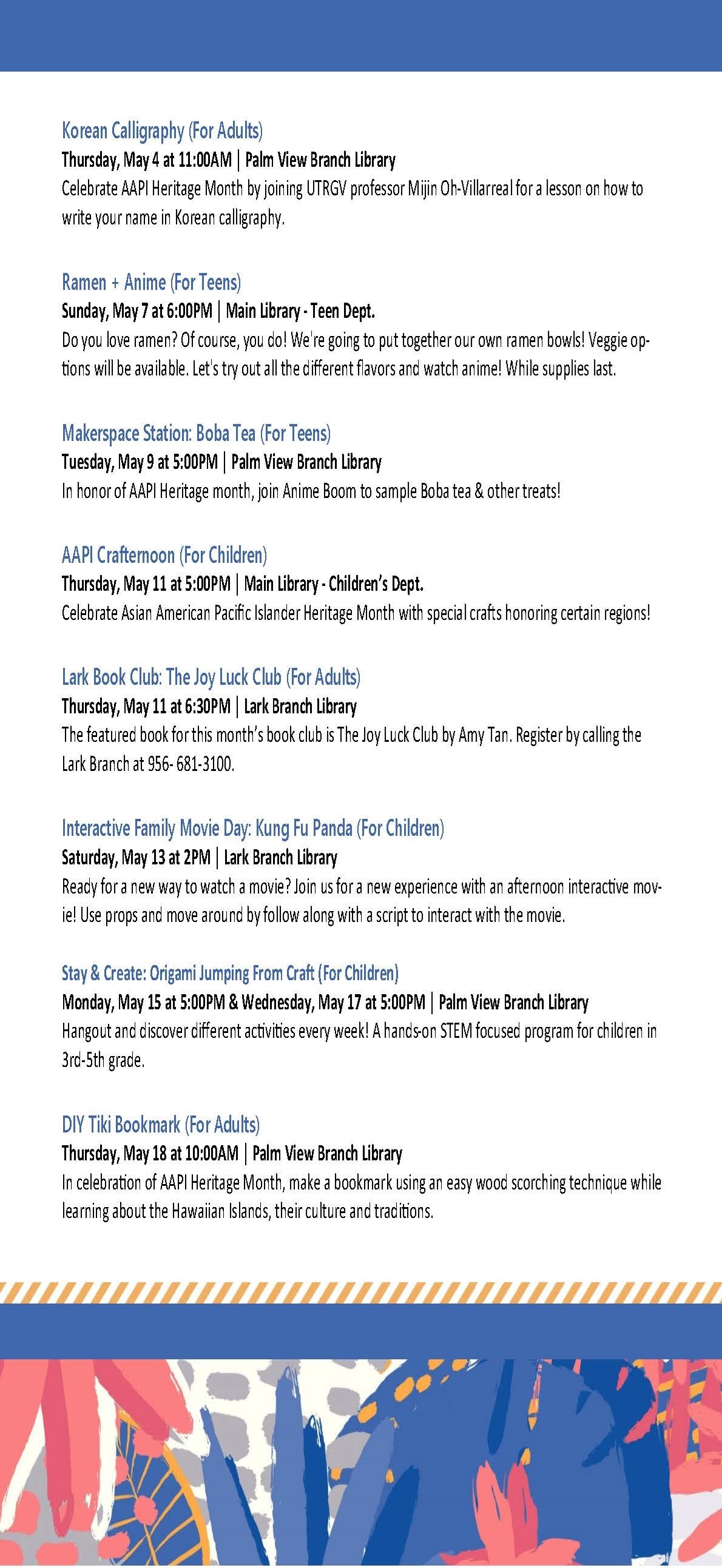 Children's Programs Baby Storytime May 1st & 8th at 1PM Post Partum Support Circle May 2nd at 6:30PM Toddler Time May 4th at 10AM May the 4th Grab-n-Go May 4th all day Nintendo Night May 5th at 5PM AAPI Crafternoon May 11th at 5PM Saturday Storytime May 13th at 11AM Once Upon a Time (Lark) May 1st, 2nd, 3rd, 8th, 9th,,10th 15th, 16th, 17th, and 18th, at 11AM Family Storytime (Lark) May 2nd, 9th & 16th at 6:30PM Crafty Kids (Lark) May 3rd, 10th & 17th at 6PM Kids Lego Club May 10th at 6PM Interactive Family Movie Day (Lark) May 13th at 2PM Bilingual Storytime La hora de los cuentos (Palm View) Mondays at 11AM TODDLER TIME with Miss Dominique (Palm View) Wednesdays at 11AM